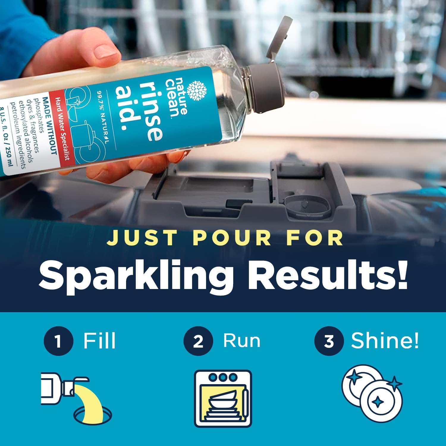- Natural Ingredients: Prioritize your family’s health with non-toxic Nature Clean rinse aid dishwasher cleaner made from 99.7% plant-based components; Free from phosphates, dyes, and fragrances, it offers a peace of mind with every wash