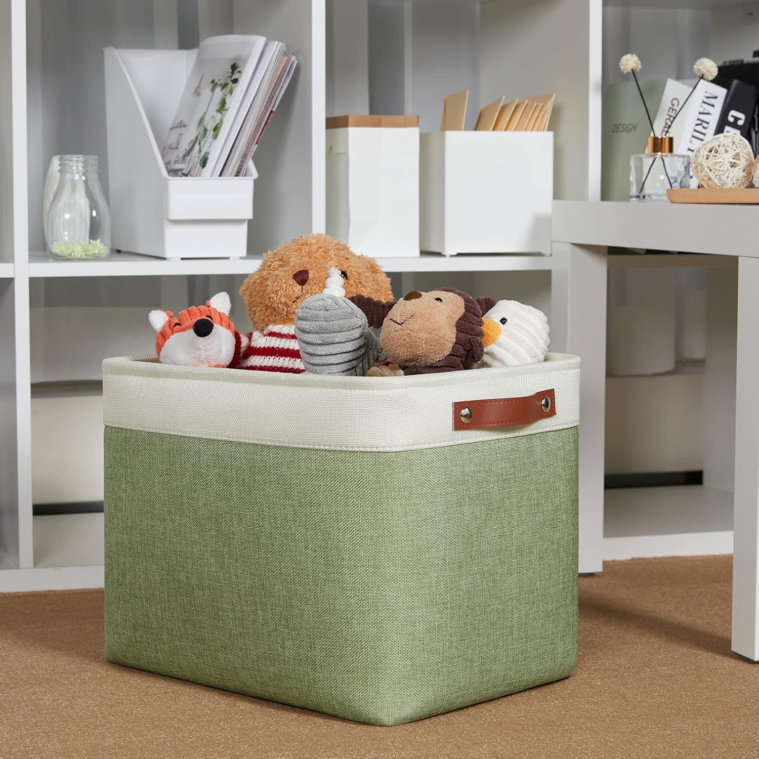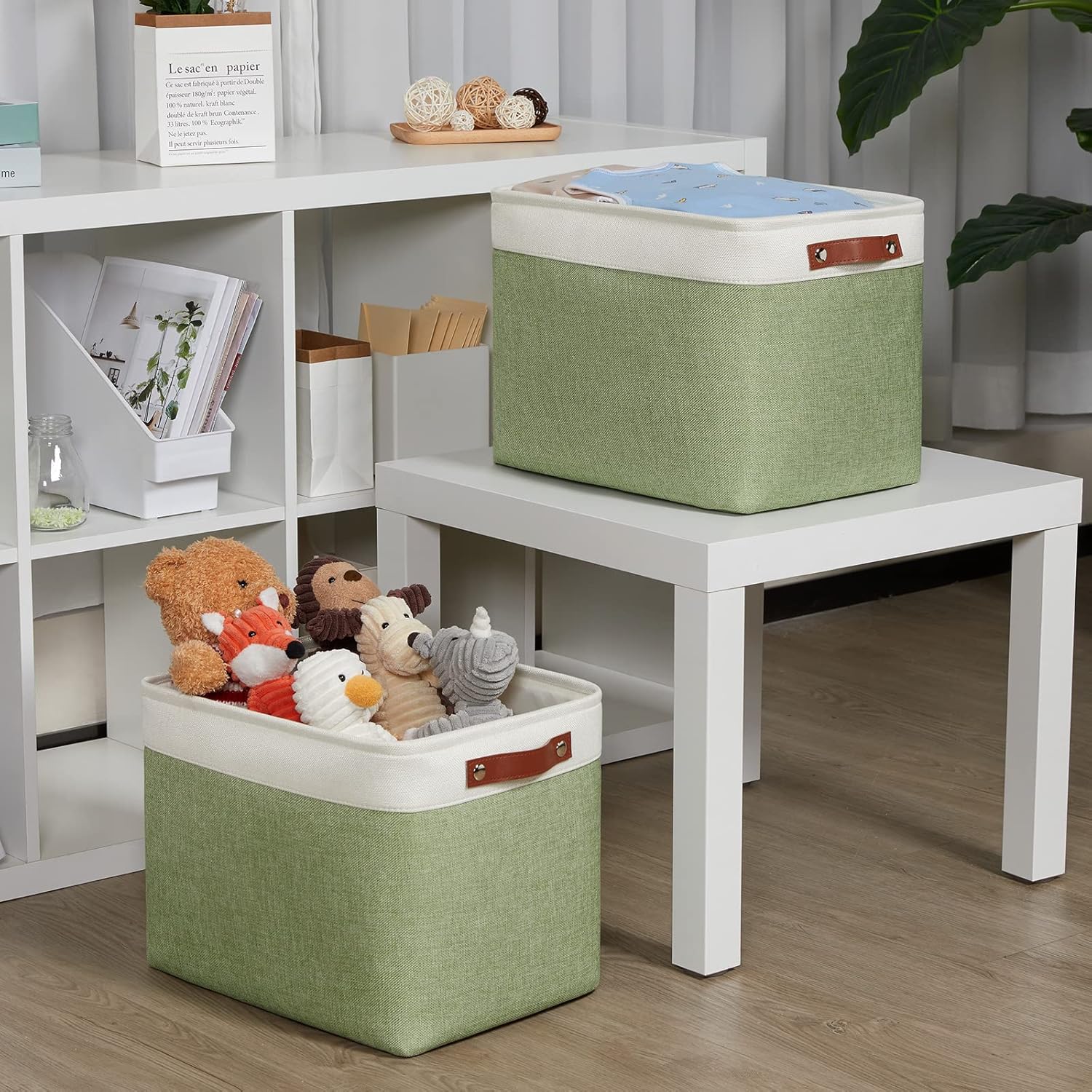 DULLEMELO 2-Pack Large Storage Baskets for Organizing 16"x12"x12" Canvas Fabric Storage Basket Bins With Leather Handles for Shelf Clothes Empty Gift Basket (White&Green)