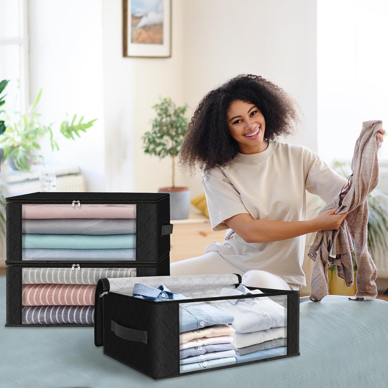 HomeHacks Storage 4-Pack Clothes Organizer Storage Bags Foldable Storage Box with Large Clear Window Sturdy Handles for Closet, Dorm, Pillows, Bedding, Clothes, Blankets, 35L, Black