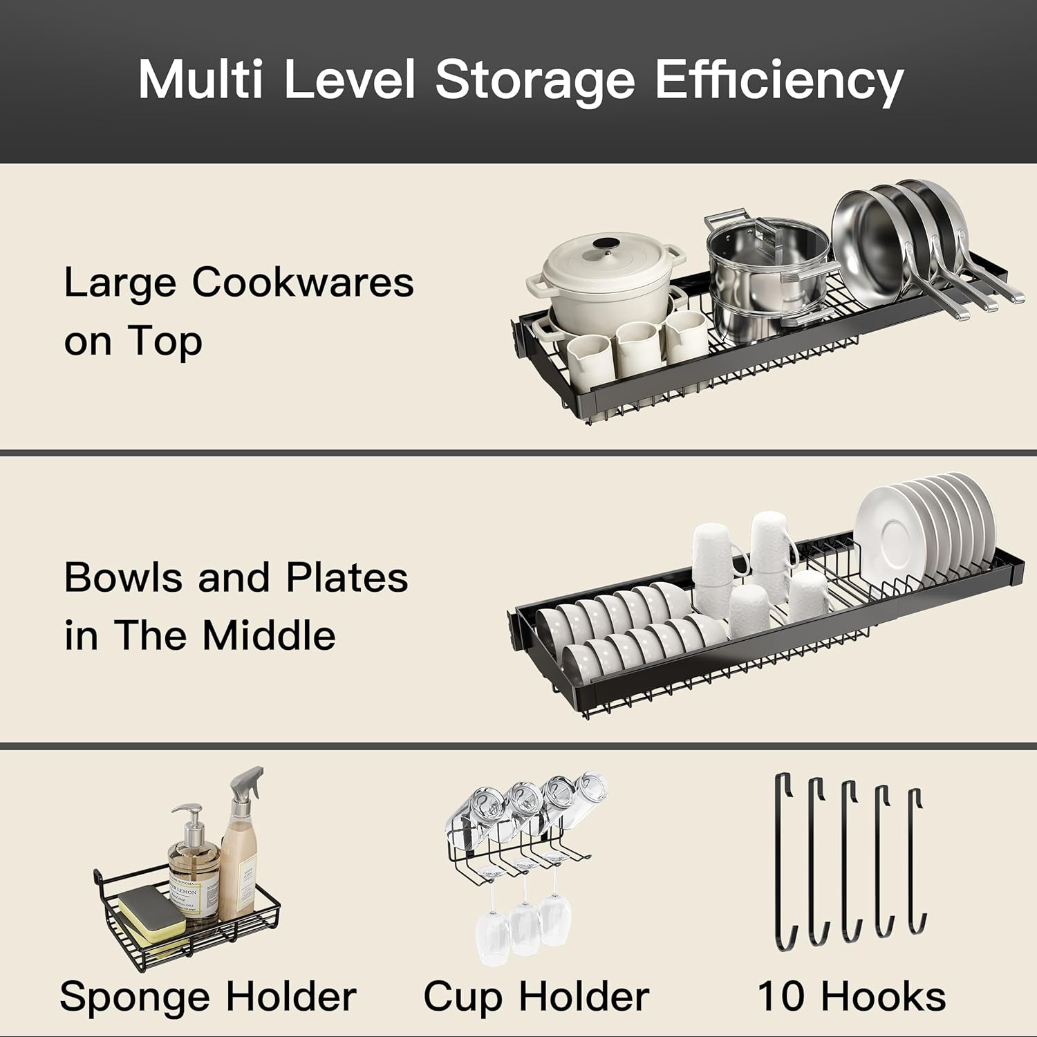 - 🧺 Multi Level Storage Efficiency: Three spacious tiers organize dishes by type, large cookwares on top, bowls and plates in the middle, while dedicated sponge holder and hanging hooks keep sponges and brushes accessible. The dish rack over sink open grid design accelerates drying by promoting airflow, reducing water spots