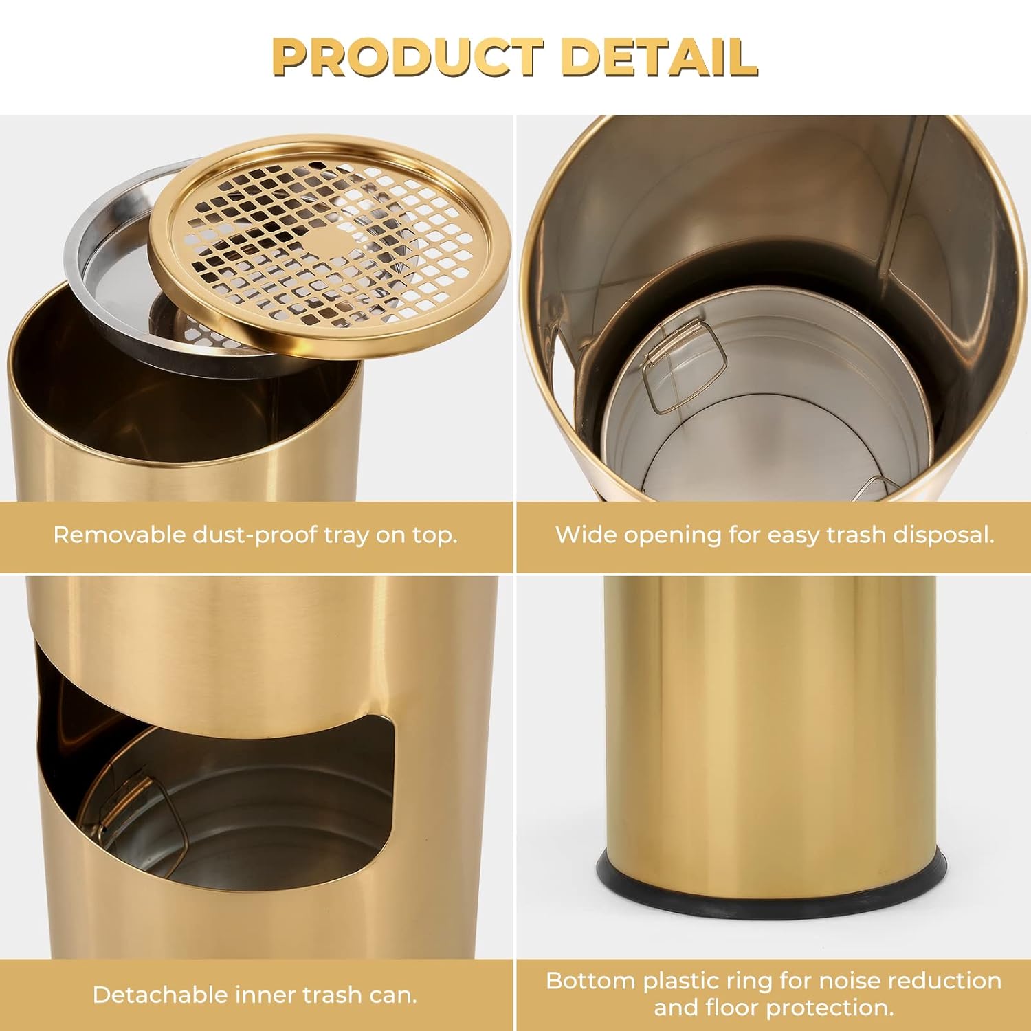 Trash Can Outdoor Waste Container Round Stainless Steel Trash Can with Removable Inner Bucket for Disposal Commercial Waste Container 9.8 x 24-Gold Tone