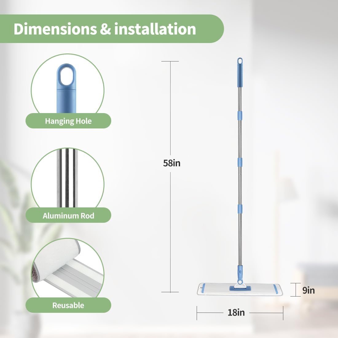 CQT Commercial Flat Microfiber Floor Mop Cleaning System 18" Inch Wet Dry and Dust Hardwood with 4 Washable Pads Cleaner for Laminate Tile Stainless Steel Handle and Extension (PT13-Blue)