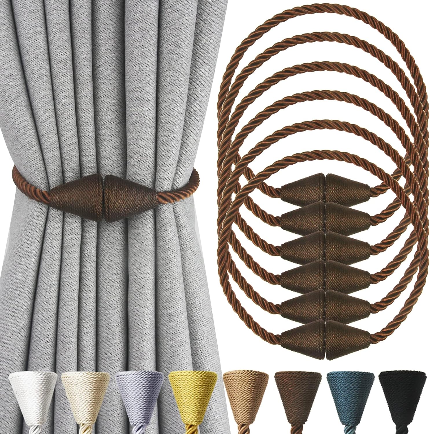 6 Pack Magnetic Curtain Tiebacks Rope Modern Handmade Curtain Tie Backs Decorative Drapes Weave Holdbacks for Window Décor, Coffee