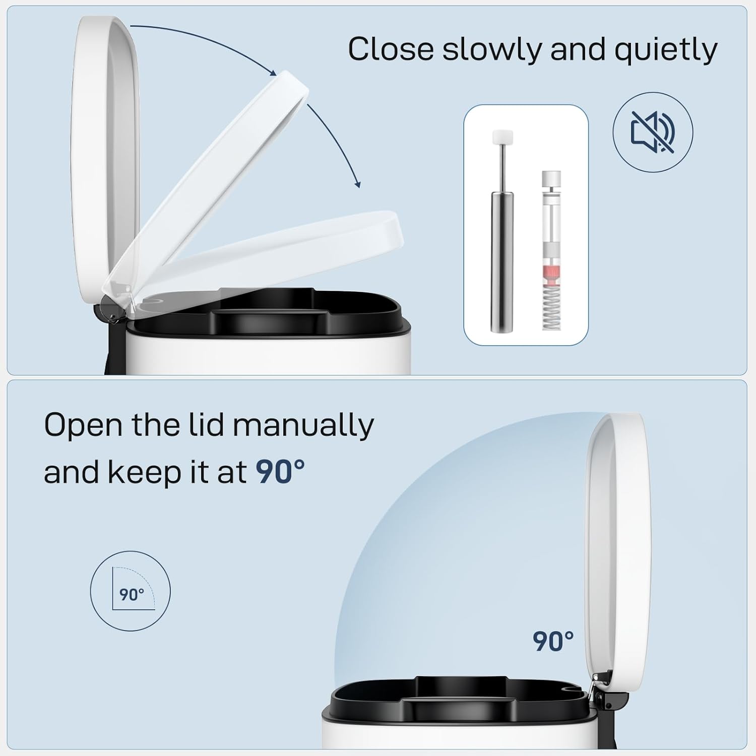 - 【WON'T DISTURB YOU】Using ABS hydraulic deceleration technology, the trash can lid can be slowly and gently closed when the pedal is released, without making a lot of noise, and it will not disturb your family when disposing of garbage.