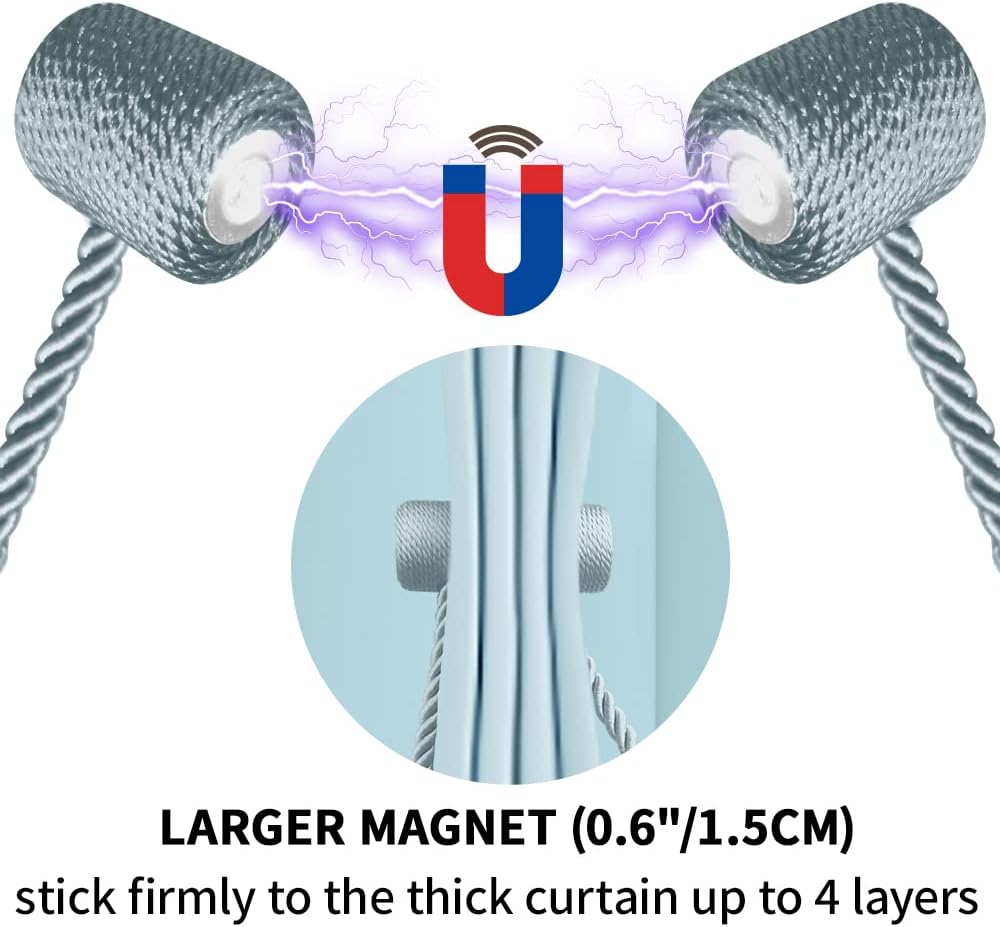 - NO DRILLING & INSTALLATION:The magnetic rope tie backs with modern upgraded stronge/durable magnets,hand-tiwsted woven texture apperance rope, heavy-duty polyester rope. No need any tools,no drilling your wall, so magnetic curtain tiebacks for drapes will not damage the wall easy to operate,hold your curtain in seconds. It is a perfect substitute for wall-mounted hooks and could be tied on anywhere, and you don’t need to worry about the extra curtain hooks hurting the child