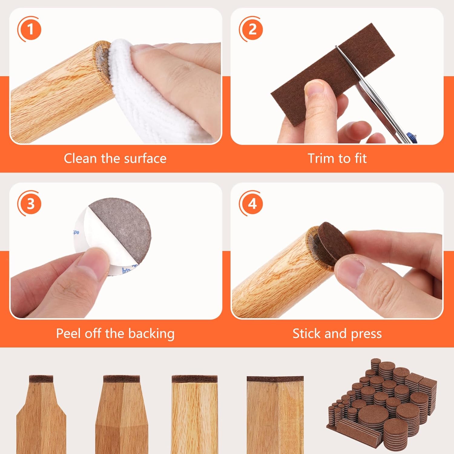 - ❤️STOP SCRATCHING YOUR FLOORS❤️ Place our felt furniture pads on the legs of your furniture to avoid scratching or scuffing your beautiful wooden, laminate or tiled floors. And you never have to hear that annoying scraping noise again. We suggest that the furniture is lifted instead of being slid on the floor in order to prevent the furniture pads from coming off.