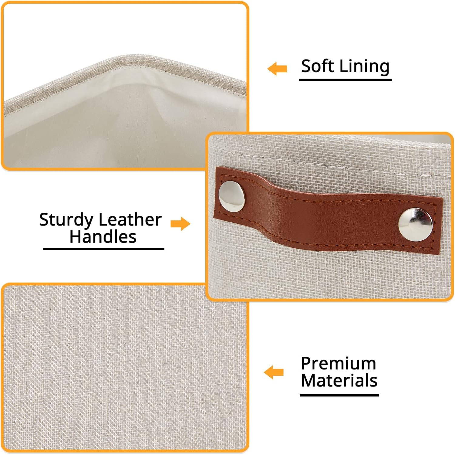 - 【PREMIUM MATERIAL】The storage basket is made with 2.5mm sturdy extra thick linen cationic fabric exterior and linen polyester interior lining. Strong upper metal keeps the shape and structural. The handles are made of premium quality leather and fixed on both sides of the basket by rivets.