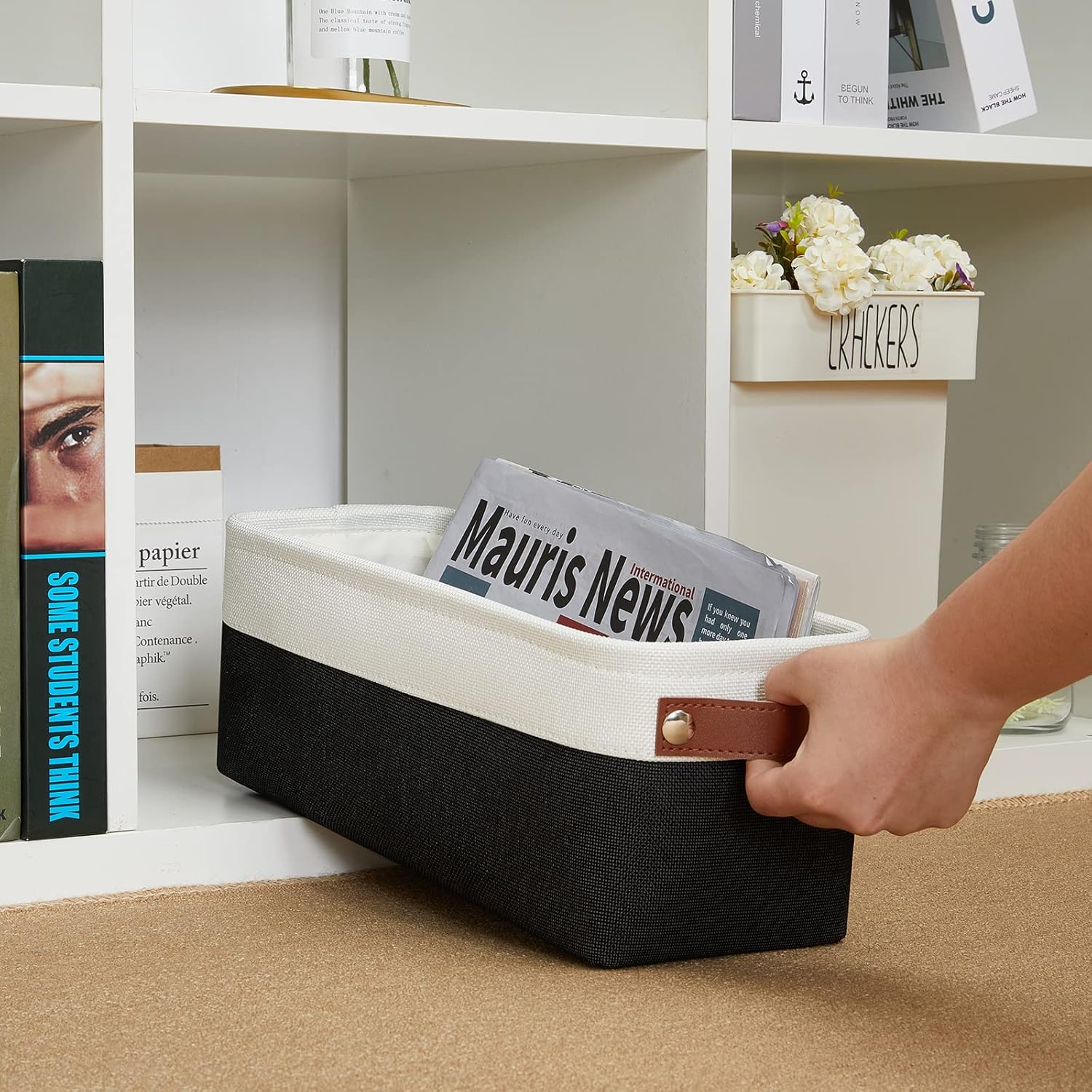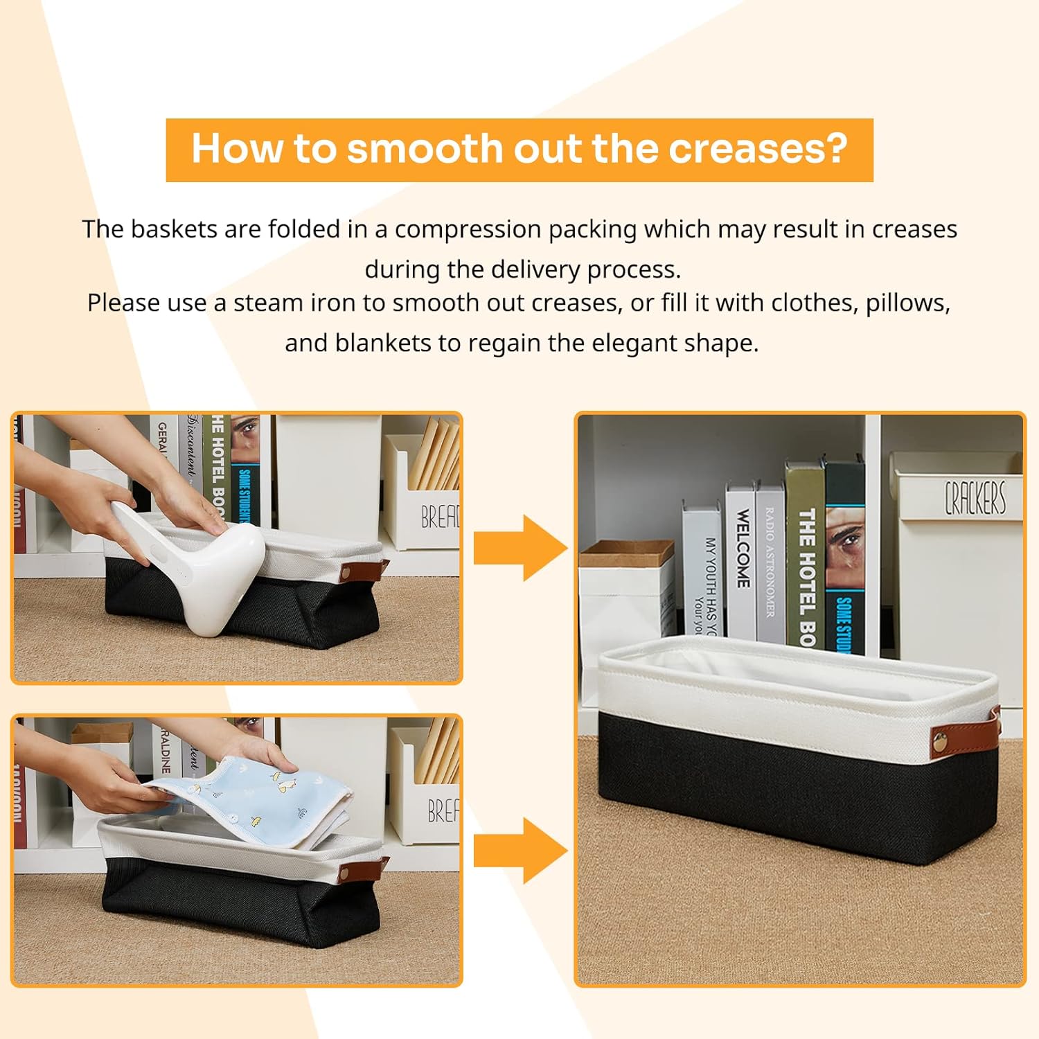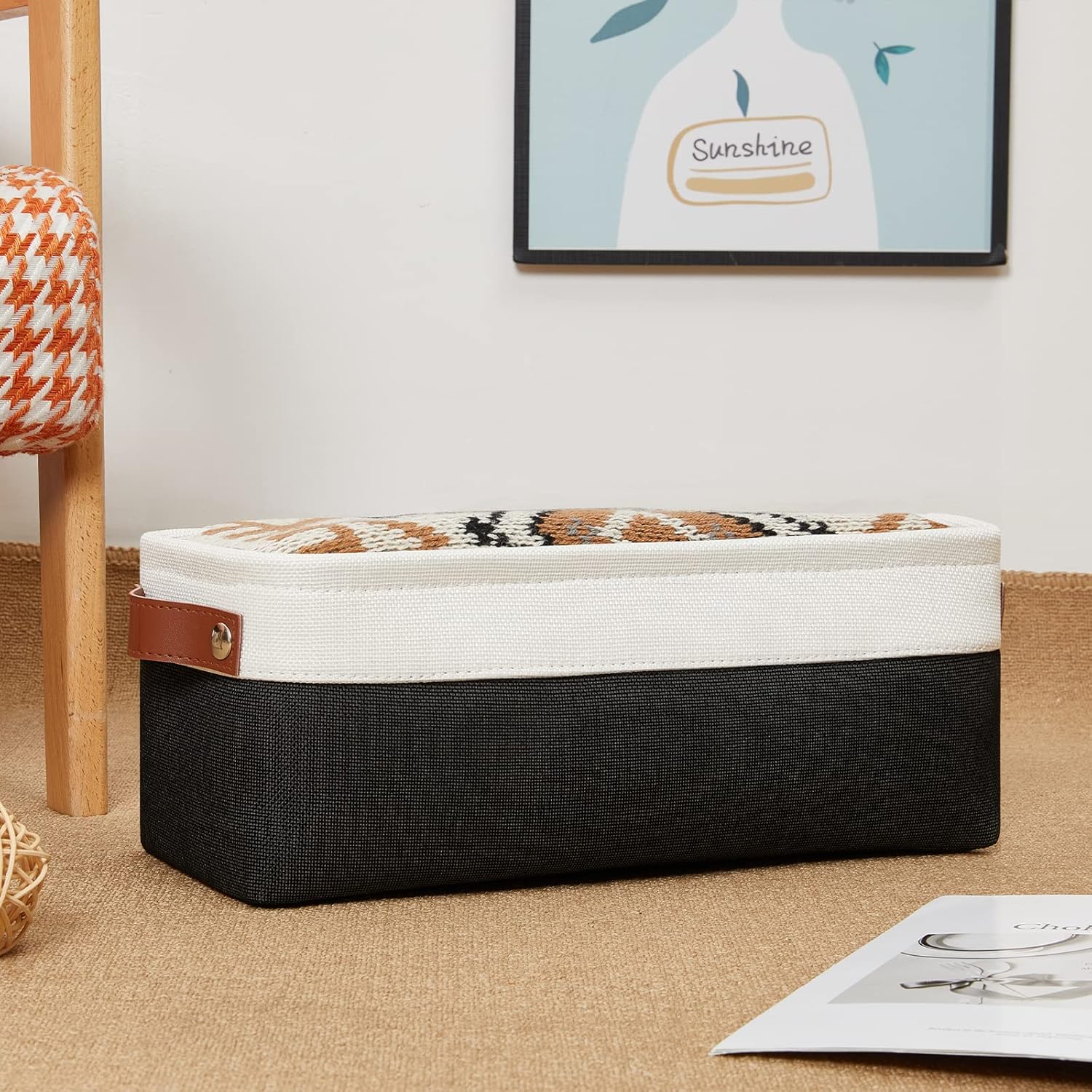 - 【EASY TO CARE】The narrow storage basket is sturdy and has no odor. Built to last these bins are reinforced with an O-ring on the top to give shape and structure so they are not machine washable. Lined with a thin linen fabric, the small storage bins are easy to clean, just wipe with a damp sponge or cloth.