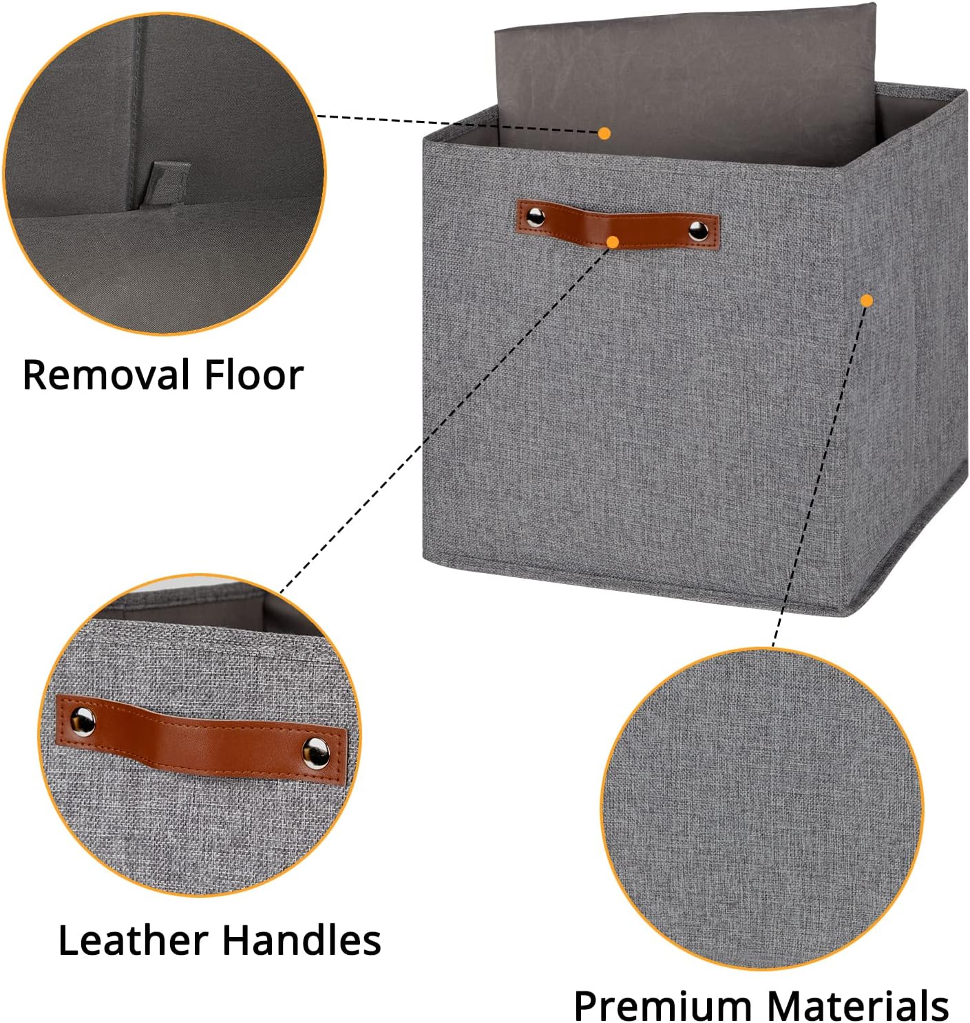 - 【Material】These cube storage bins are constructed of sturdy and attractive linen & cardboard with linen interior lining. The sturdy leather handles make it easy to carry or pull off and out of shelves.
