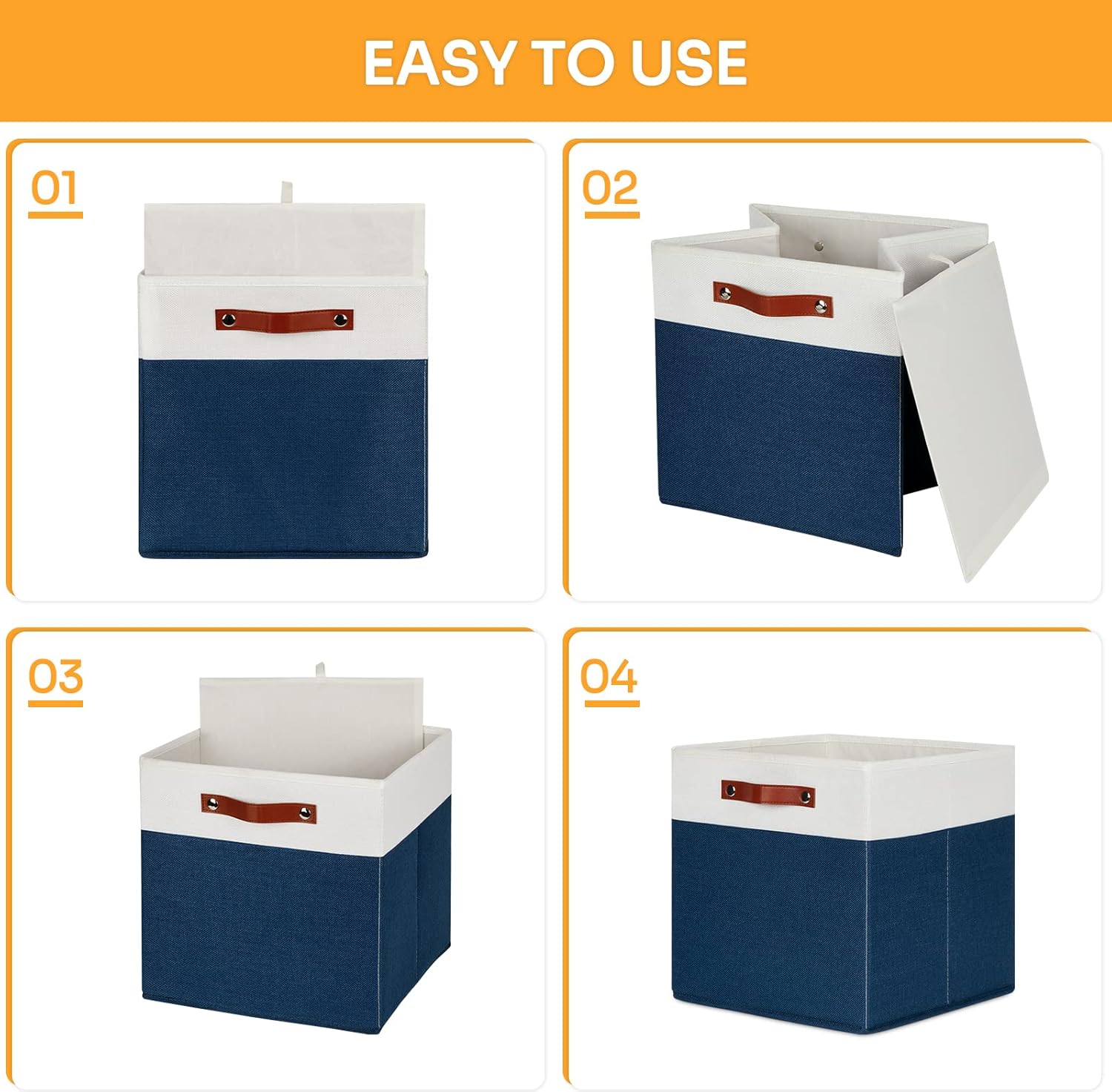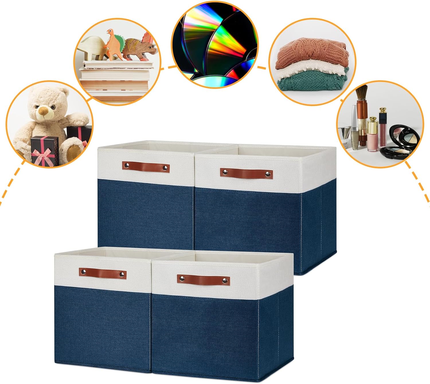 DULLEMELO 13 inch Cube Storage Bins, Gift Baskets Empty for Boy Girl Mother Father Christmas Festival,Fabric Storage Bins Cube Organizer Baskets With Leather Handles(White&Blue-4 Pack)