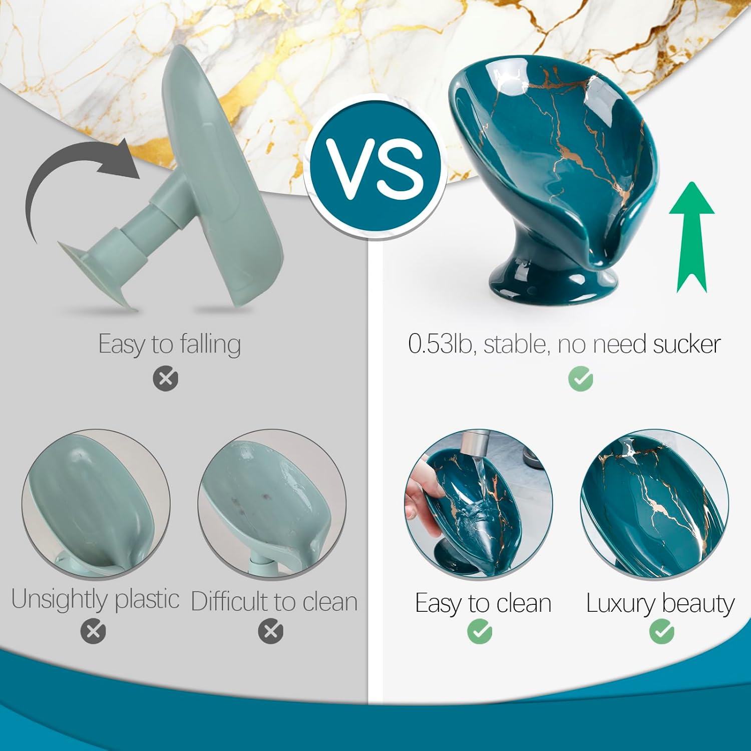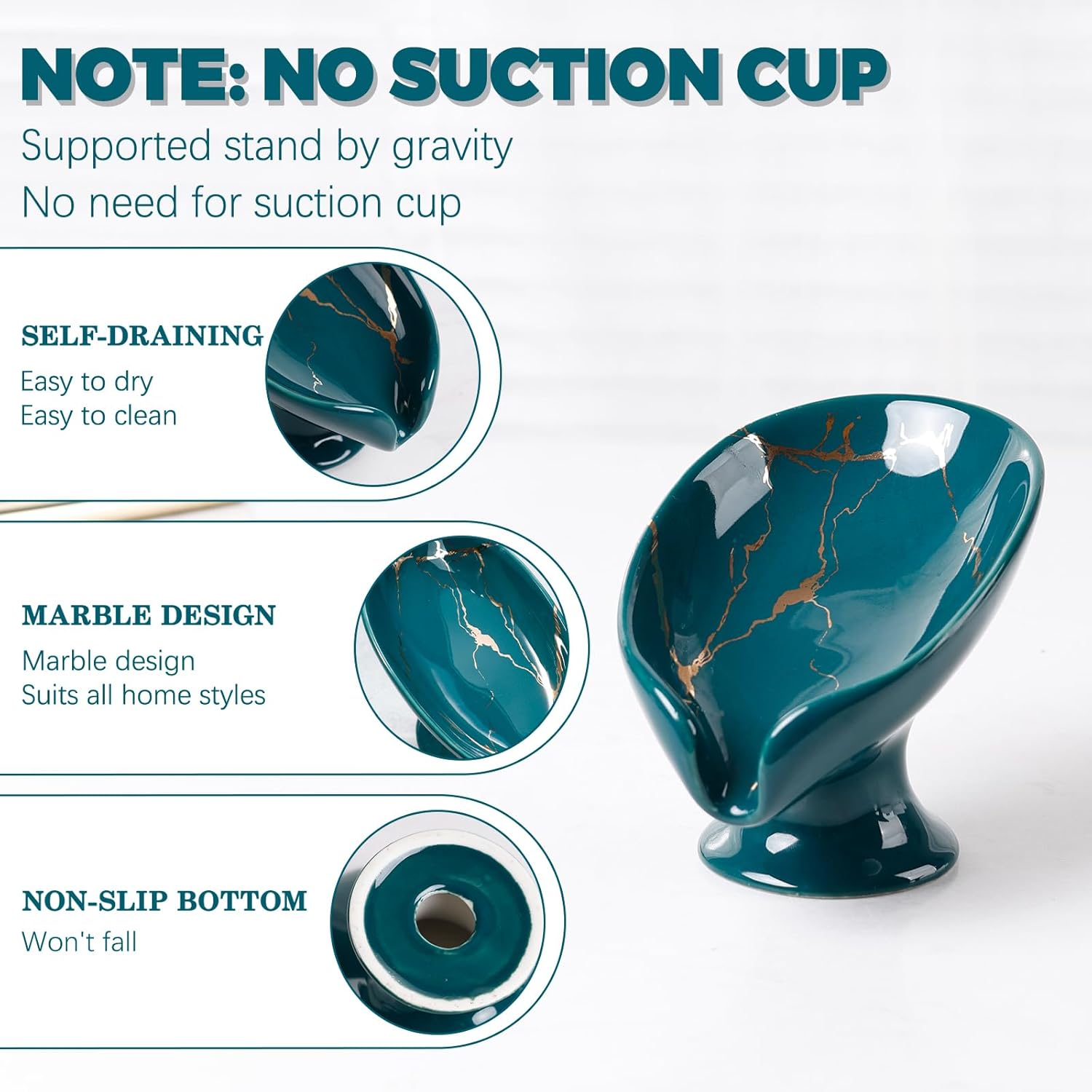 Soap Dish, Ceramic Soap Holder Self Draining Leaf Shape Bar Soap Holder, Marble Look Green Drain Soap Dish Holder for Bathroom, Easy to Clean Keeps Soap Dry, ANTIS'S HOME