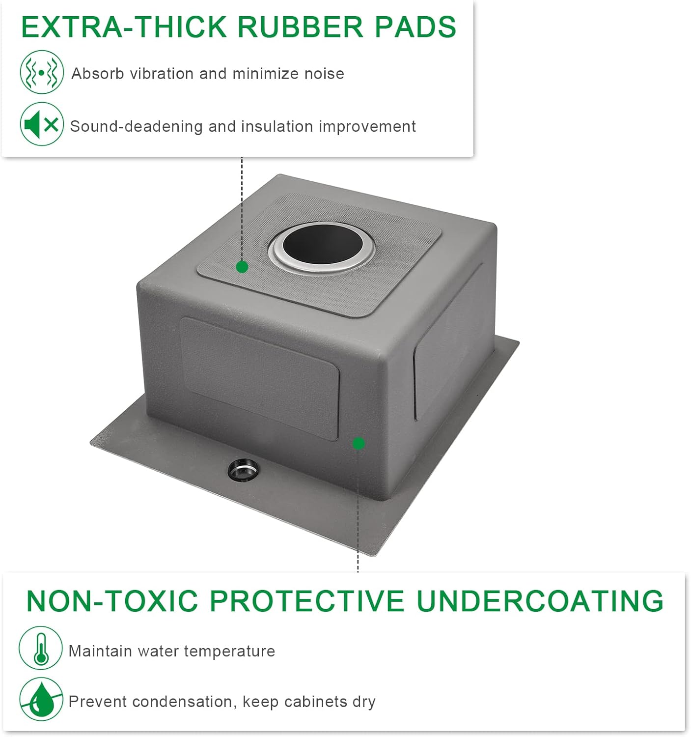 - 【Quiet Kitchen Sink】Thick rubber pads installed on the bottom of this drop in bar sink and with heavy paint coating, the sound of washing and garbage disposal gets appeased and it ultimately protects your cabinet from condensation while draining boiling water
