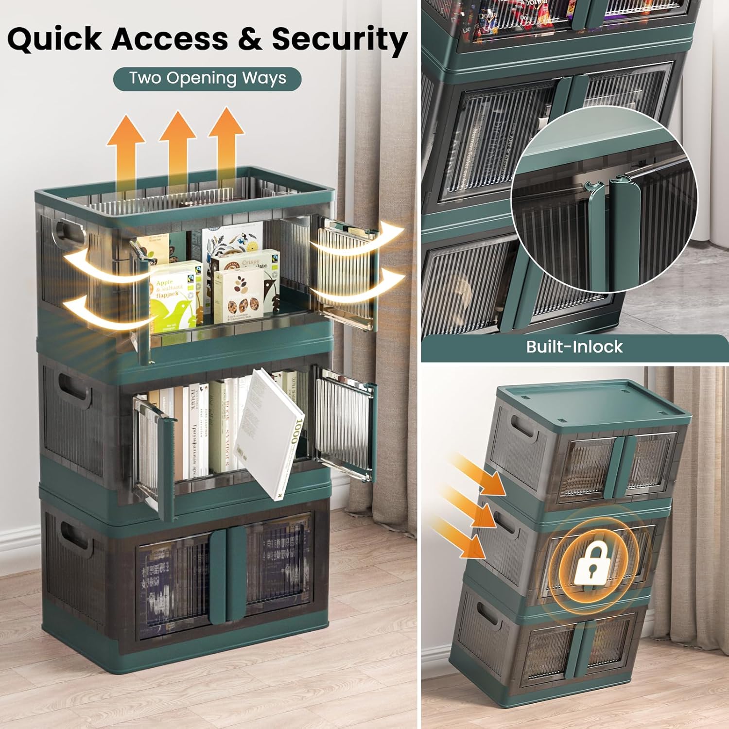 8.4Gal Collapsible Storage Bins with Lids & Wheels - 3 Pack Stackable with Doors, Heavy-Duty Plastic Containers for Home/Office, Green