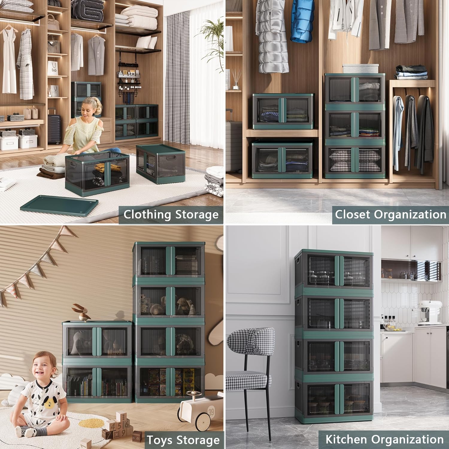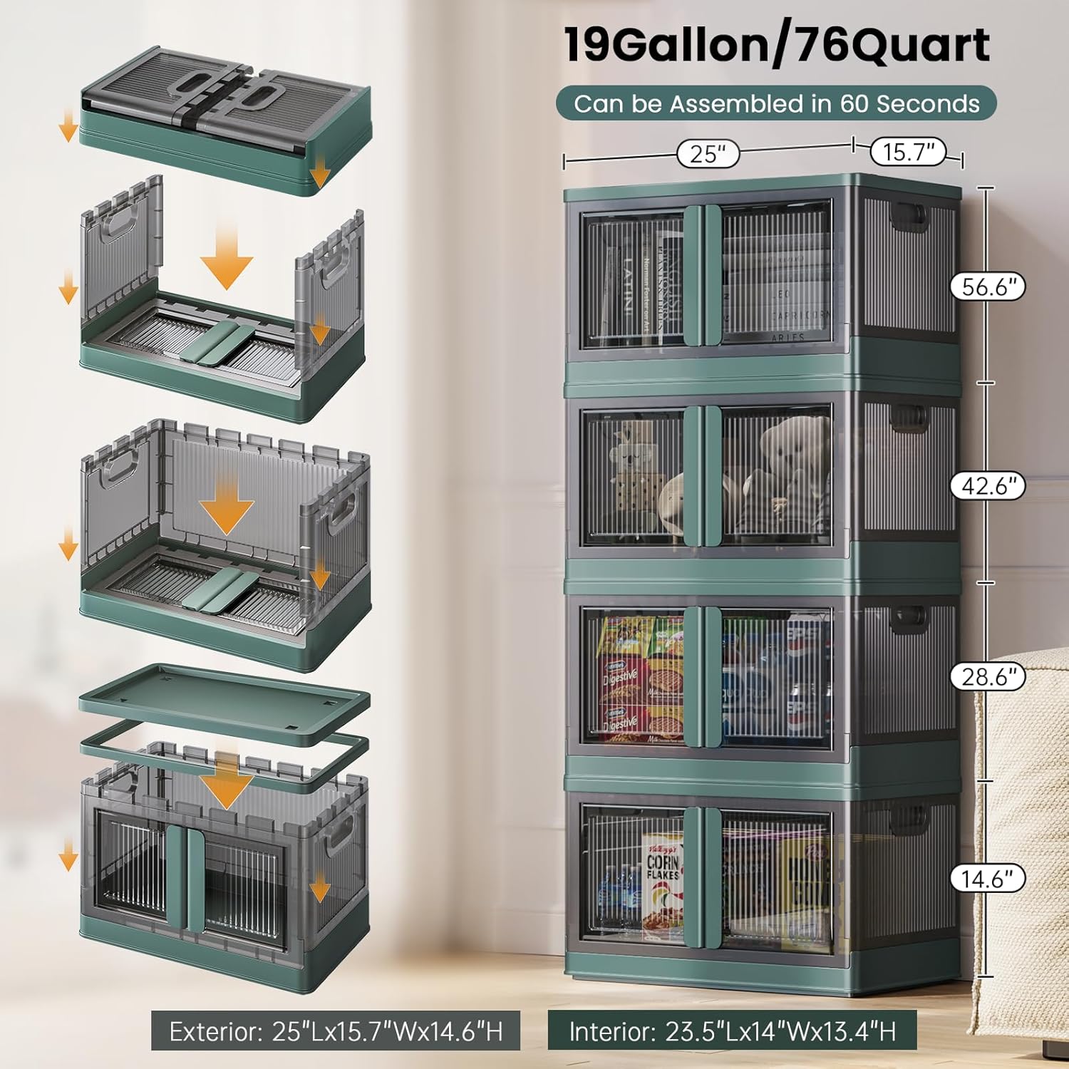 19Gal Collapsible Storage Bins with Lids & Wheels - 3 Pack Stackable with Doors, Heavy-Duty Plastic Containers for Home/Office, Green