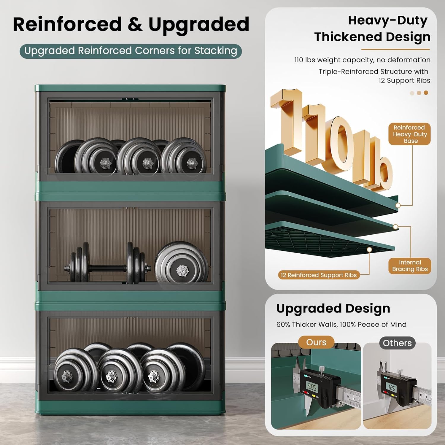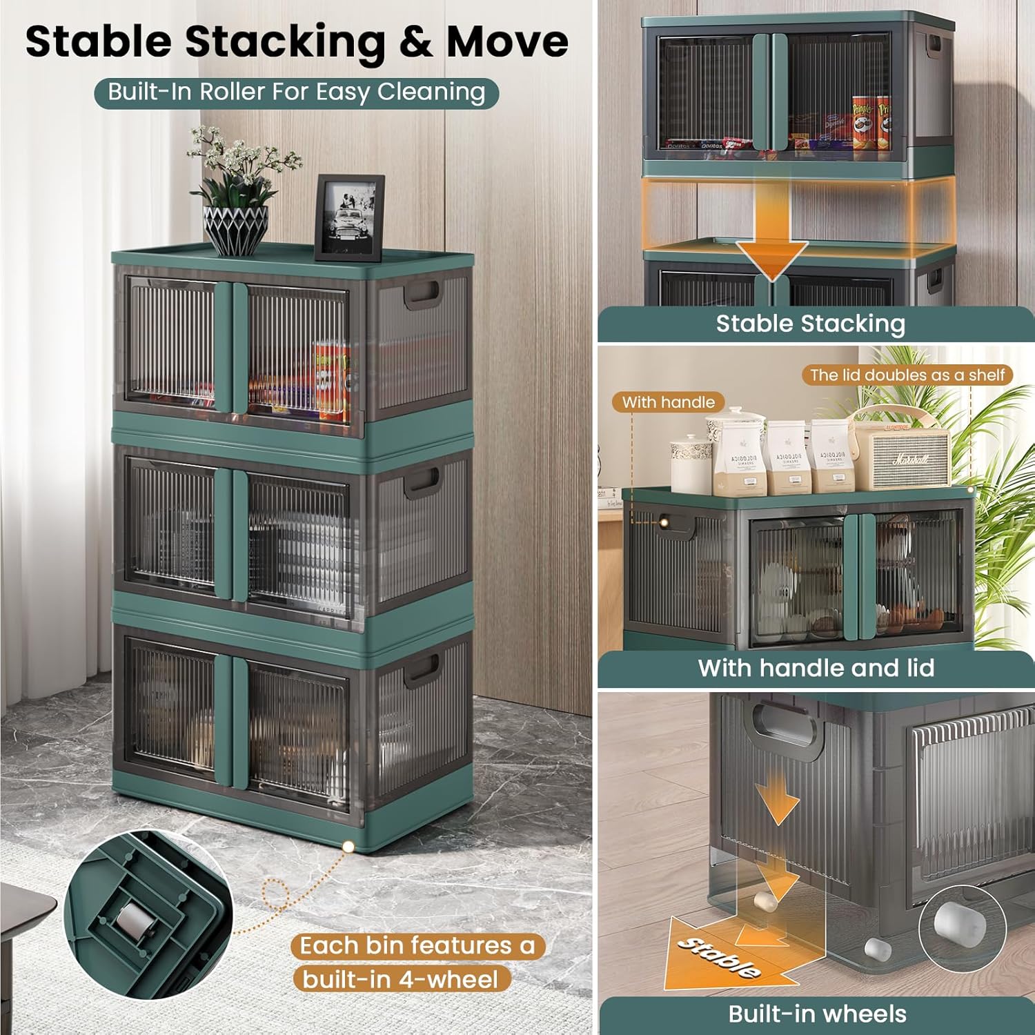 19Gal Collapsible Storage Bins with Lids & Wheels - 1 Pack Stackable with Doors, Heavy-Duty Plastic Containers for Home/Office, Green