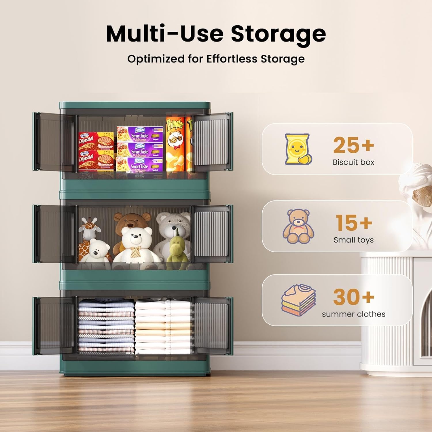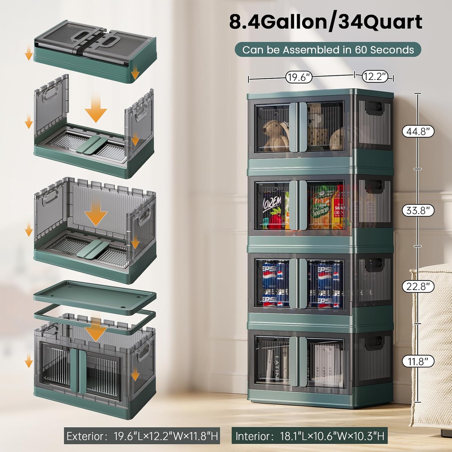 8.4Gal Collapsible Storage Bins with Lids & Wheels - 1 Pack Stackable with Doors, Heavy-Duty Plastic Containers for Home/Office, Green