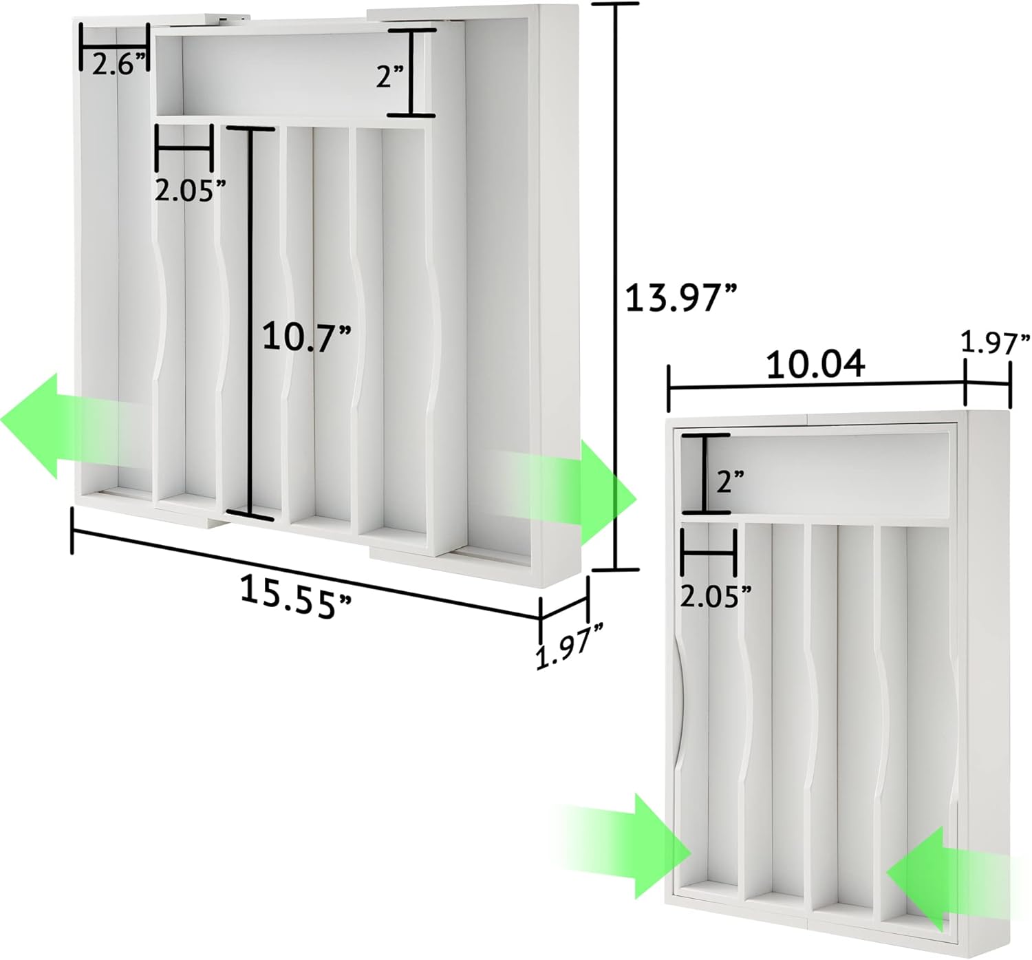 - [TWO-PIECE SET]: This 2-Piece 10.04" - 15.5" wide, 13.98" long and 1.97" deep bamboo drawer organizer can tame your out-of-control kitchen drawers, to store and organize the cutlery and kitchen utensils according to your rules, and maximize the drawer storage. Keep everything accessible and organized, so that you don't have to rifle around for your cooking tools. Beautiful and practical kitchen drawer organizer turns the cooking and tasting into things of beauty and efficiency.
