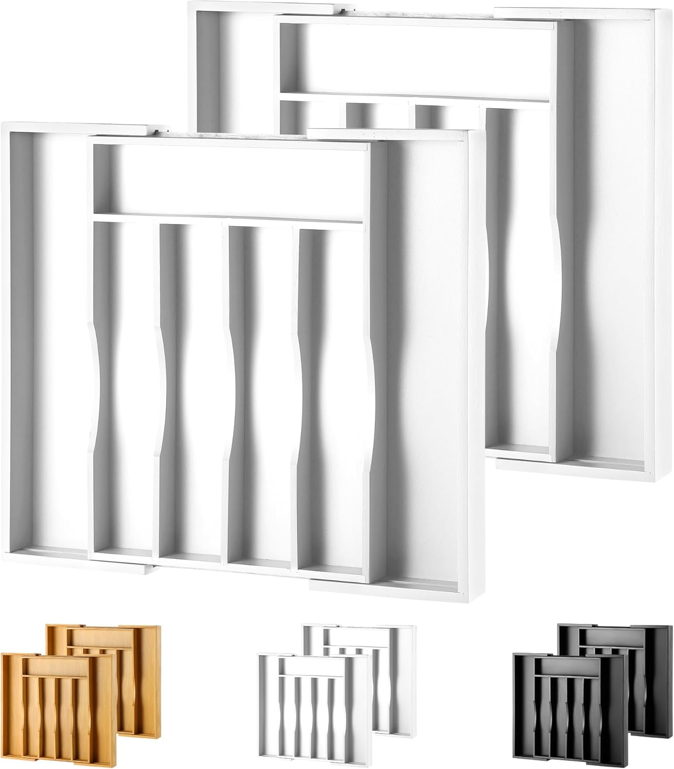 2-Piece Expandable Bamboo Kitchen Drawer Organizer for Cutlery and Utensils, Adjustable Bamboo Wood Cutlery Tray in Drawer for Flatware and Silverware in Kitchen, (White)