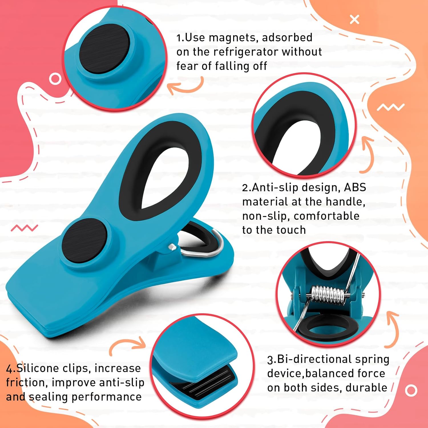 - You will receive: Set includes 12 Blue magnet clips with soft touch handles - the perfect shape and size clip for all different sized bags of chips and food. sufficient quantity for you daily using and replacing demands, also nice to share with your family and friends who need it