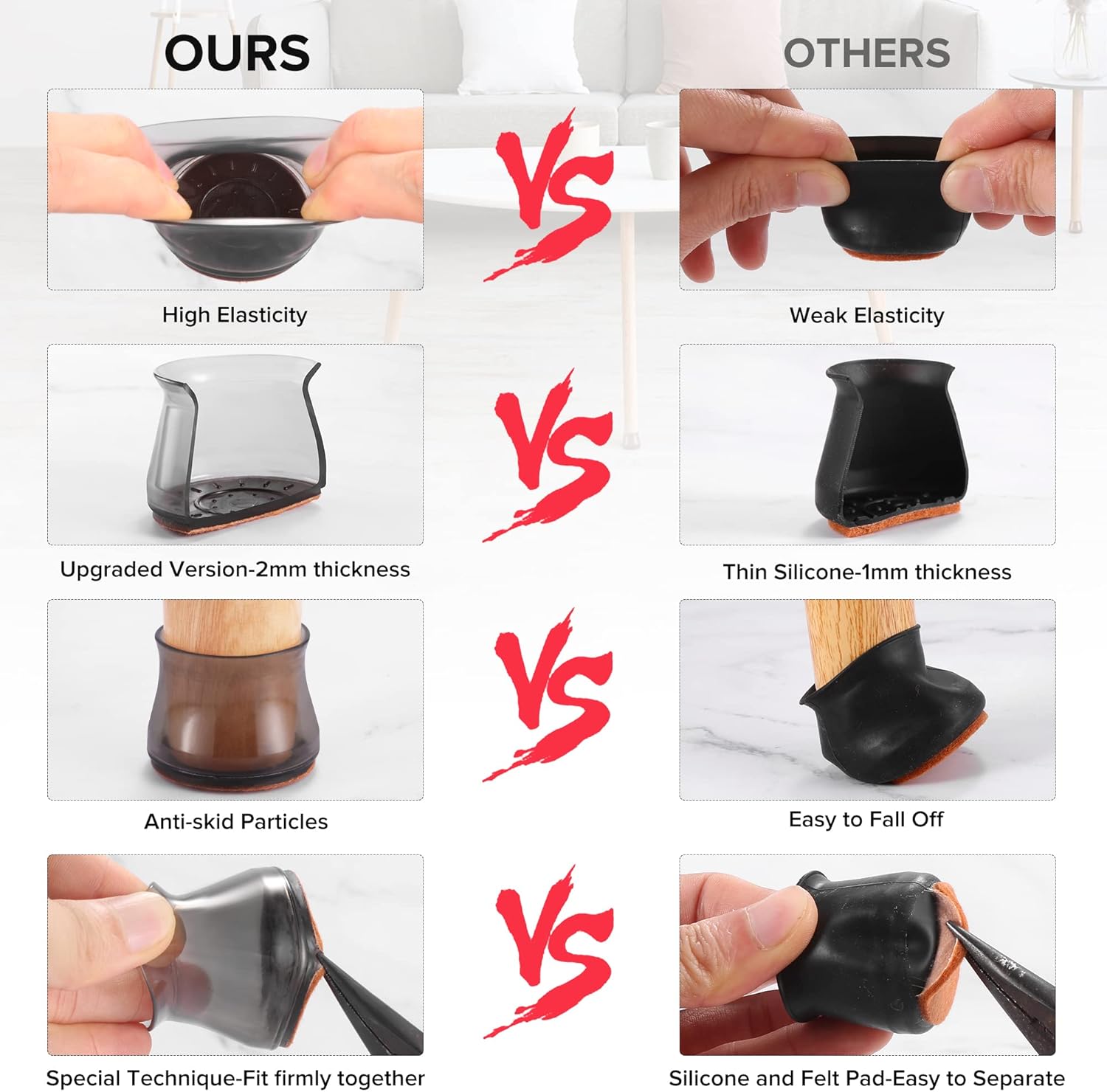 - ✅【Comprehensive Improvement】The rubber protectors are made of a combination of silicone covers and felt pads.Gels and nails are not used. After investigation, it is found that the chair leg cushions made of silicone and gel are easy to separate the felt after use, and the silicone will break. So after improvement, we injected the silicone and felt into one body, and the inner wall was thickened to 2mm, which greatly enhanced the pull resistance and abrasion resistance of the chair leg cushions.