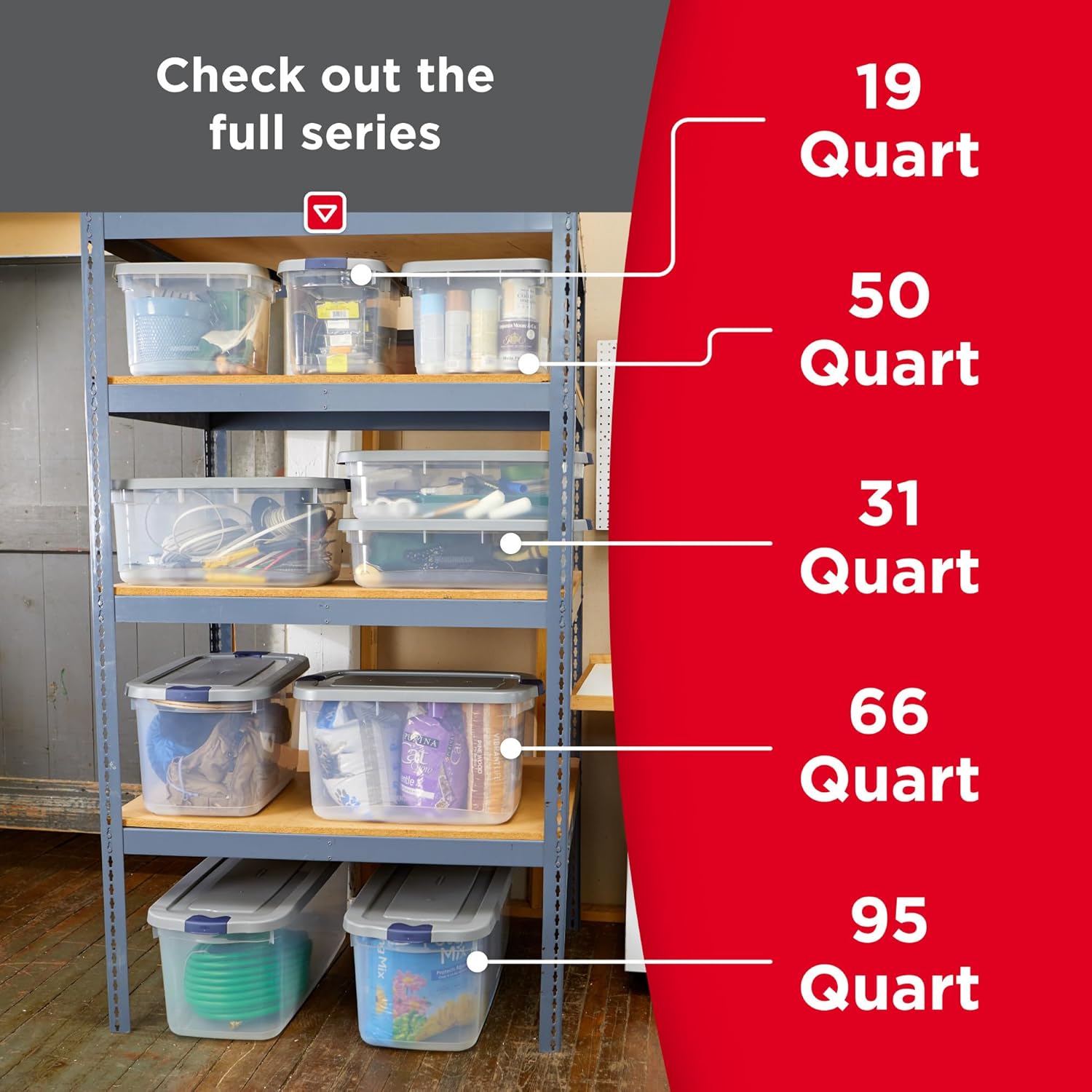 - MID TO LONG-TERM STORAGE: Perfect for attics, basements and garage storage where temperatures may fluctuate from hot to cold. Equipped with an audible snap-tight lid to ensure your items are protected from dust and pests. Built in handles make these totes easy to carry. Clear base makes locating and accessing belongings easier.