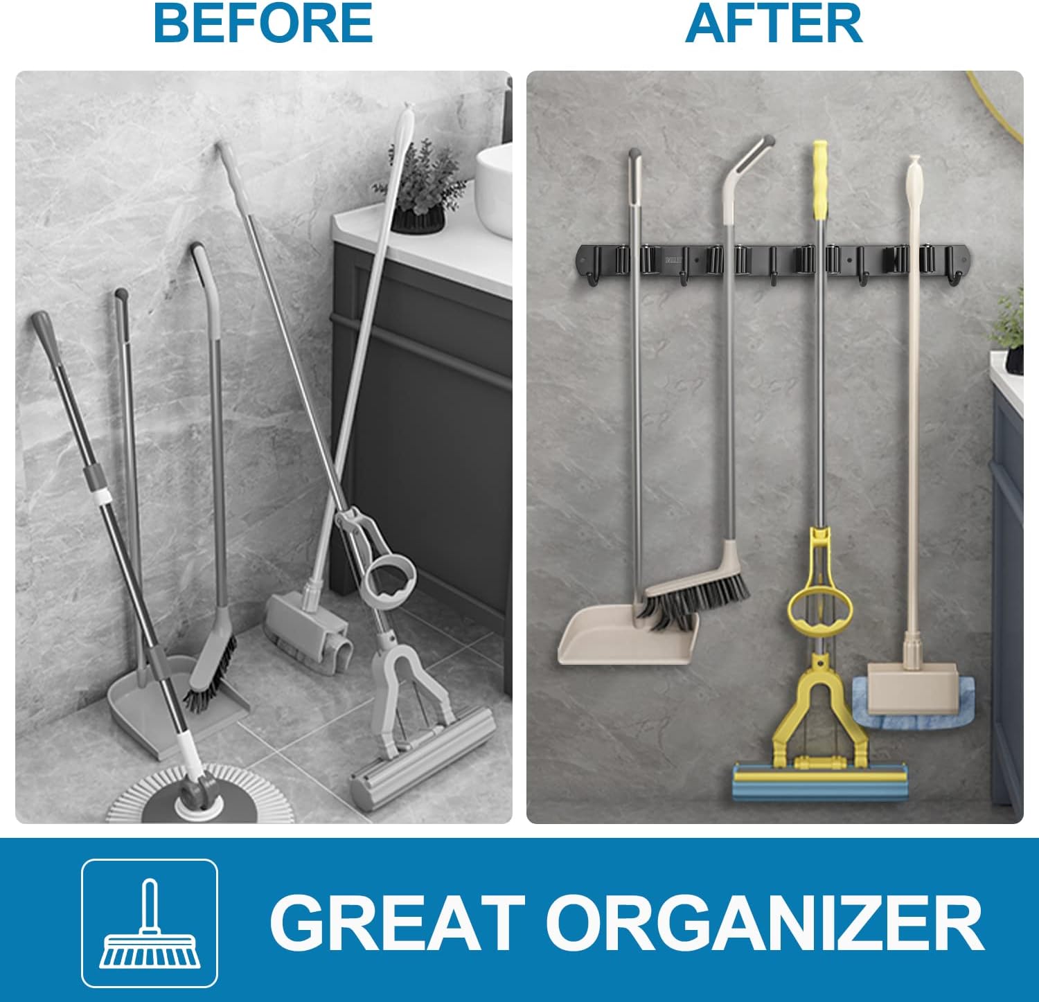 - 🧹 VERSATILE DESIGN: You can easily organzier your home, such as laundry room, kitchen, closet, garage, pantry, basement. This garage organizer also works garden or a shed. You can easy access your broom, mop, swifter, dust pan, small vacuum, rakes, shovels and more.