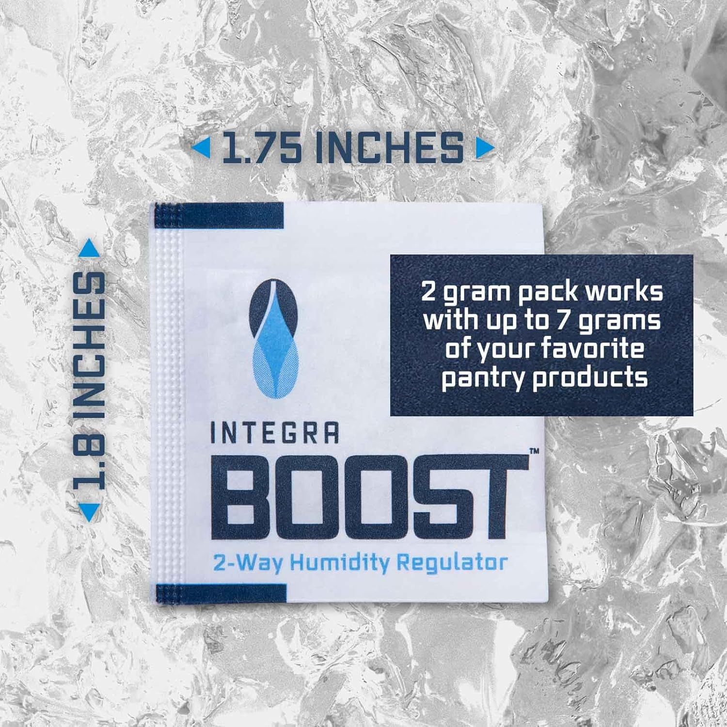 - 2-GRAM BOOST EFFICIENCY: Each 2 gram Integra Boost pack manages moisture for up to 7 grams of product, ideal for smaller storage. This pack includes 50 individually wrapped Boost Packs with Humidity Indicator Cards.