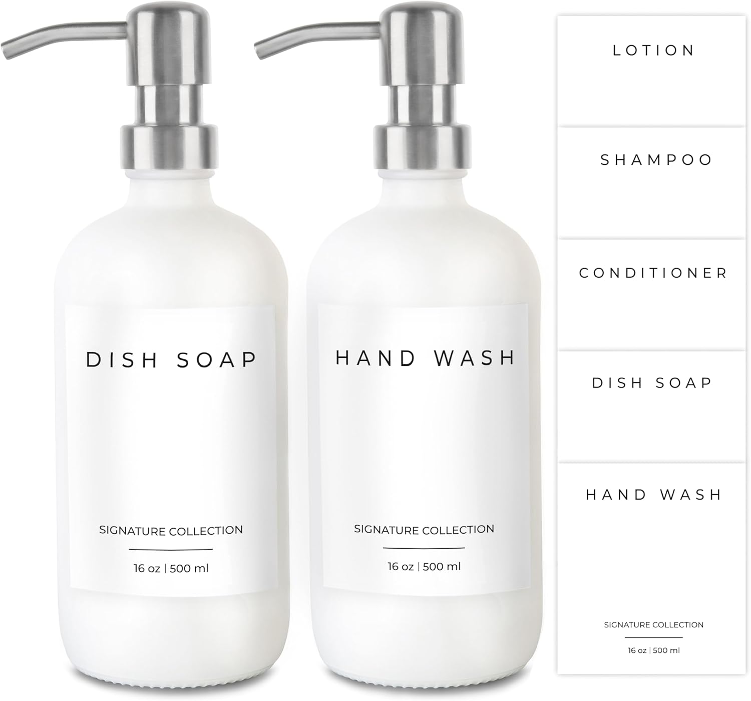 - ✅ 2-in-1 COMBO: Upgrade your home with our glass soap dispenser set. The dish soap dispensers are crafted from the highest quality glass and can be used as soap dispensers for kitchen sinks, soap dispensers for bathrooms, or as hand soap dispenser of your favorite liquid. The kitchen soap dispensers come with 2 dish soap dispensers for kitchen bottles (16 ounces), 2 stainless steel pumps, and 5 waterproof labels. Our selection includes colors including amber, clear, white, and black.
