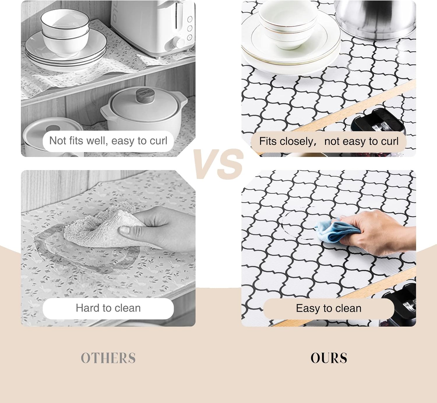 - WATERPROOF AND EASY TO CLEAN: These storage cabinet liners are waterproof and dust-proof which keeps belongings in your kitchen cabinet, fridge and drawer organized and protected from grease and spills. The non-adhesive kitchen shelf liner is easily removable and can be cleaned with mild soap and water
