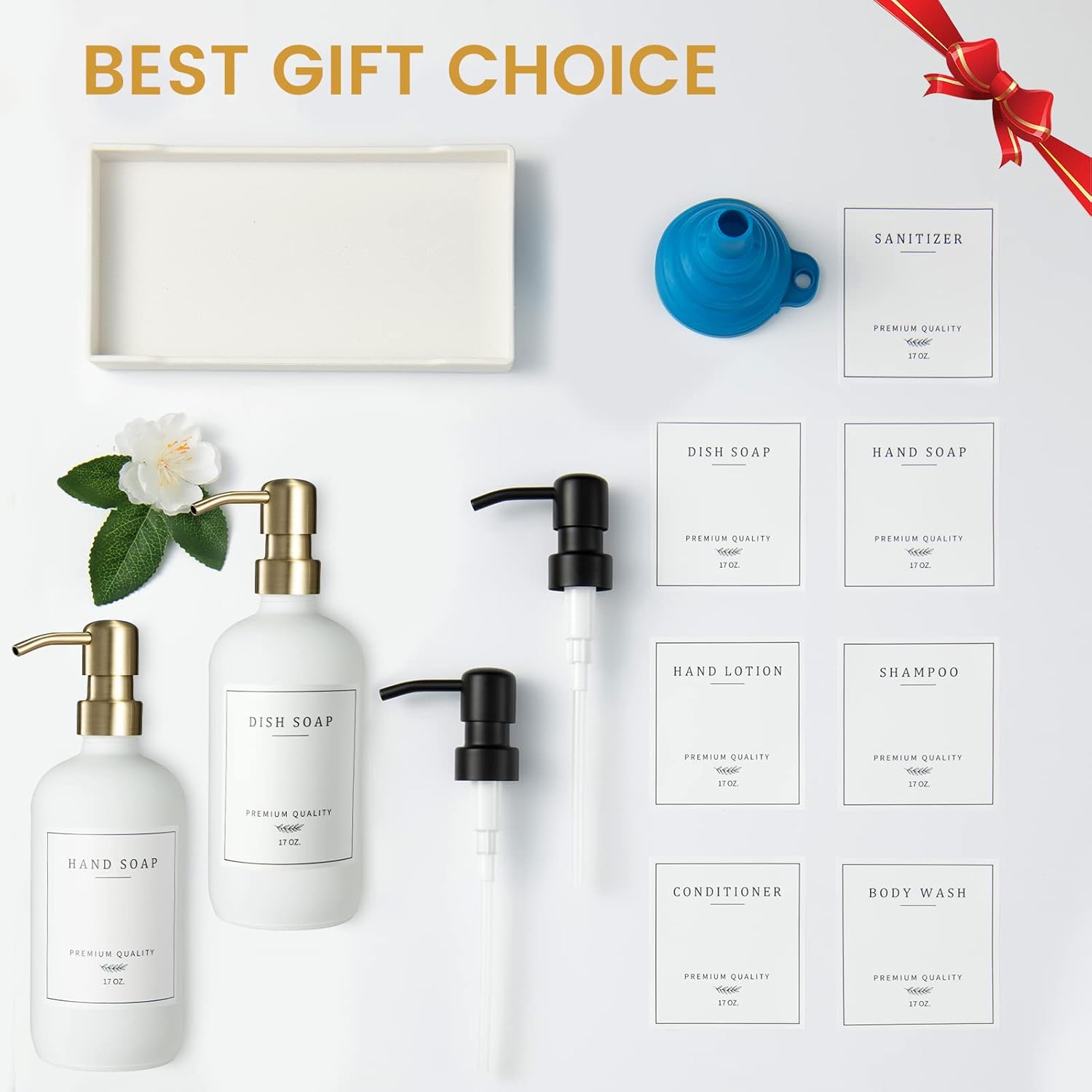 - GREAT VALUE FUNCTIONAL & AESTHETIC DISH AND HAND SOAP DISPENSER SET: 2 fortified lead-free reusable glass kitchen soap dispenser, 2 gold + 2 black stainless steel pump to better match your sink hardware, 1 collapsible silicone funnel, 1 white durable soap dispenser tray, 7 kinds of waterproof stickers ( Hand Soap, Dish Soap, Hand Lotion, Shampoo, Conditioner, Body Wash, Sanitizer), suitable for any style of home decor.