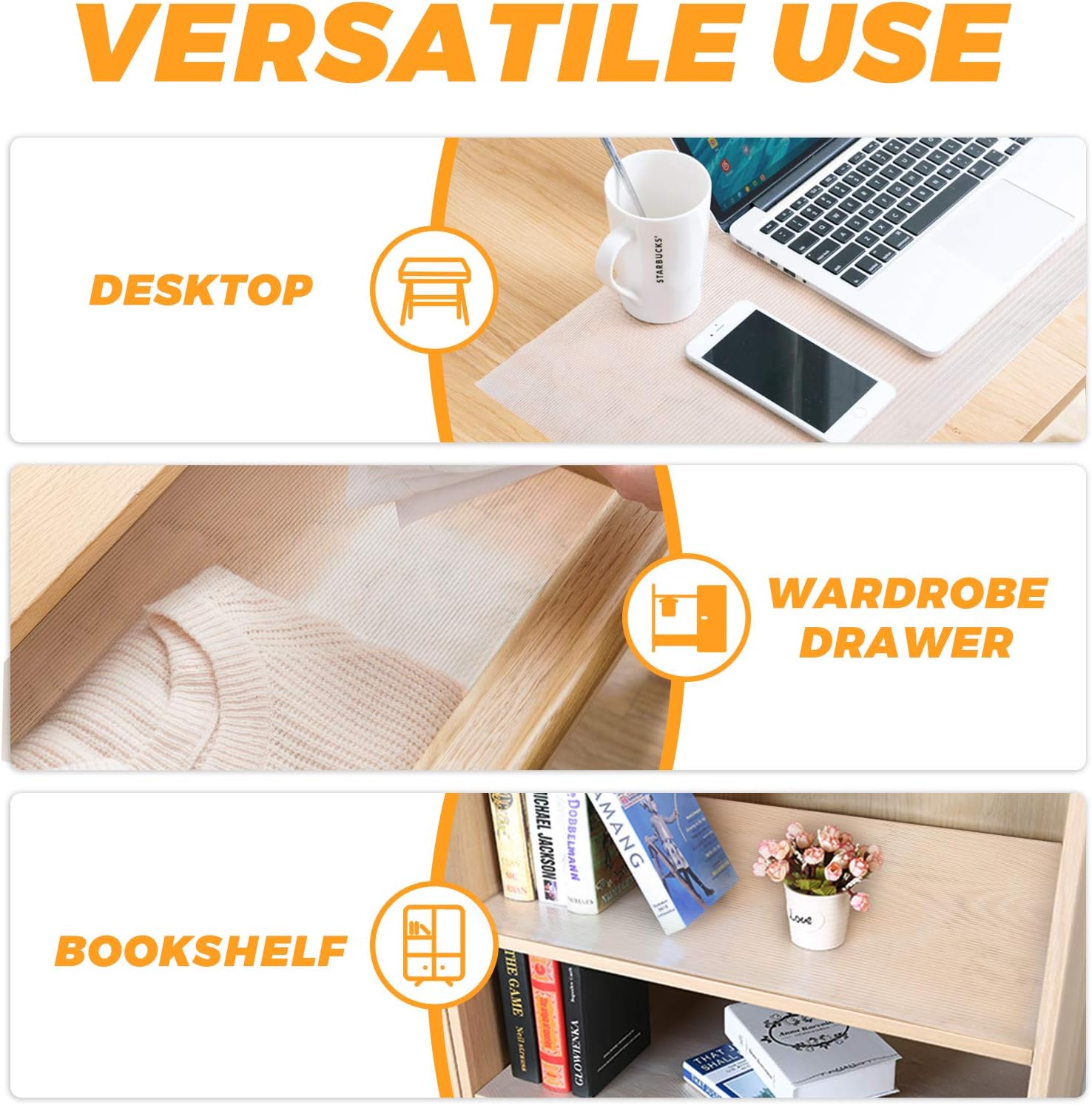 - 👍 PERFECT STORAGE SOLUTION- These shelf liner come in 12" x 20 ft. Made of eco-friendly EVA material and feature a non-slip design, the shelf liners for kitchen cabinets help prevent spillage by keeping your items locked into place and free from unwanted dirt and debris. The plastic drawer liners for dresser is ideal for use in a top drawer, bedroom dresser, bathroom cabinets, kitchen cabinets and desk drawers for organizing and protecting small items from damage or scratches.