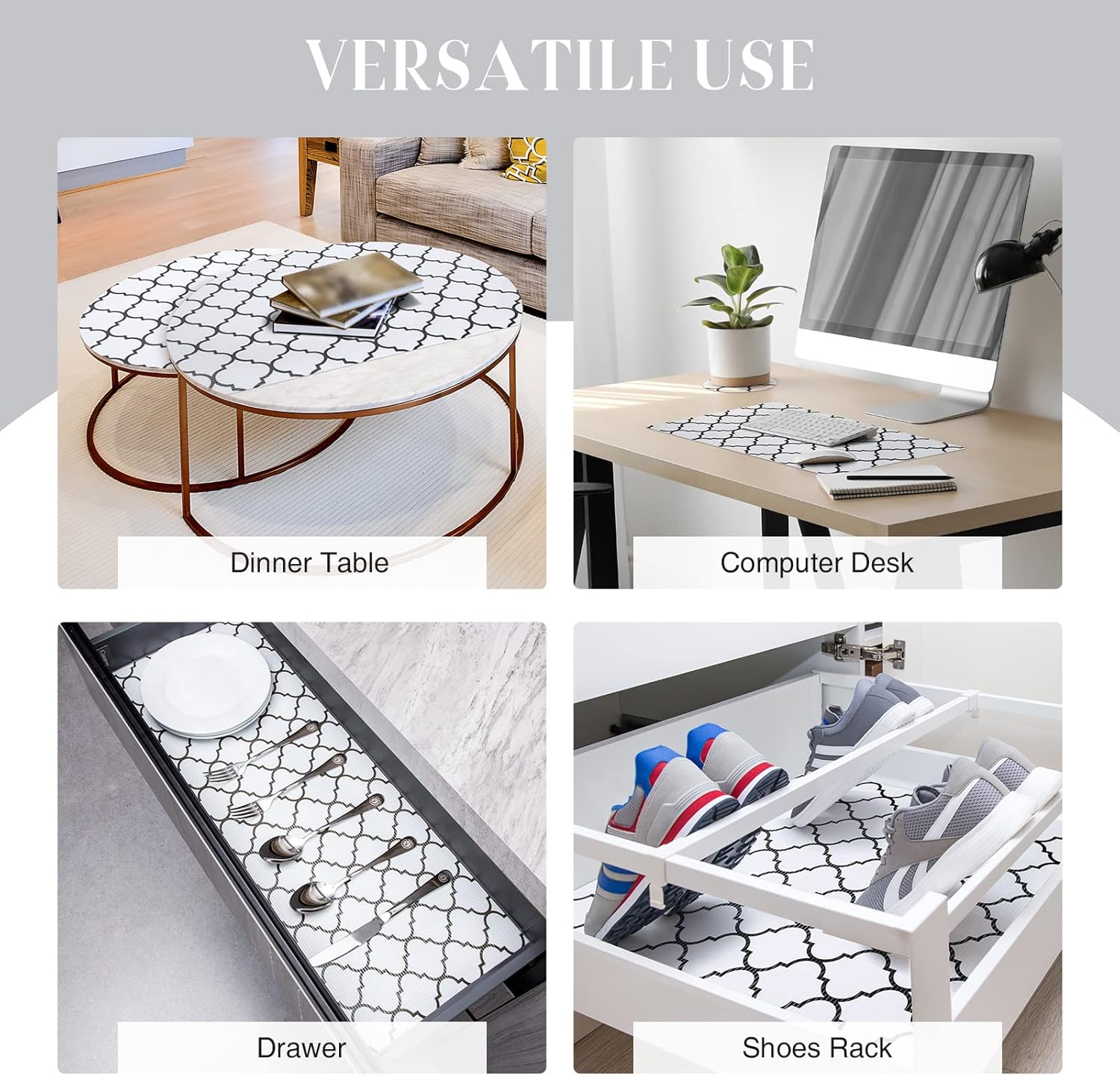 - 👍 NON SLIP CABINET LINERS FOR SHELVES- Measured 24” x 20 ft. with a non-slip double-sided mat, this kitchen drawer liners help prevent spills in storage spaces by keeping your items locked in place and free from unwanted dirt and debris. The quatrefoil design of this wire shelf liner is not only beautiful but also effective to secure your belongings on the wire shelf, glass shelves and so on.