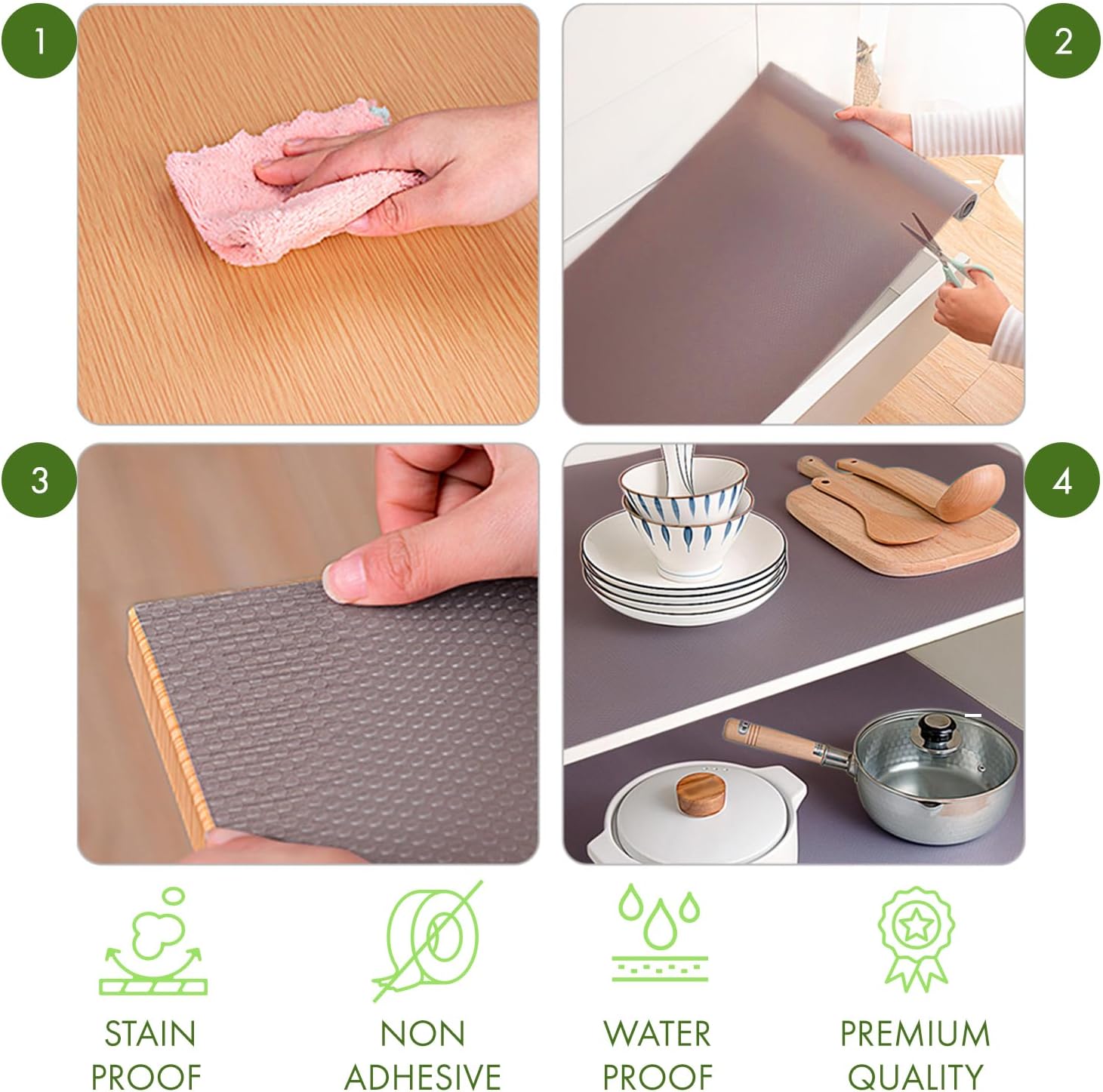 - Waterproof Material: This waterproof cabinet liner protects surfaces from moisture, making it ideal for kitchen and bathroom use. The shelf lining is designed to be a reliable waterproof drawer liner, safeguarding your cabinets from water damage.