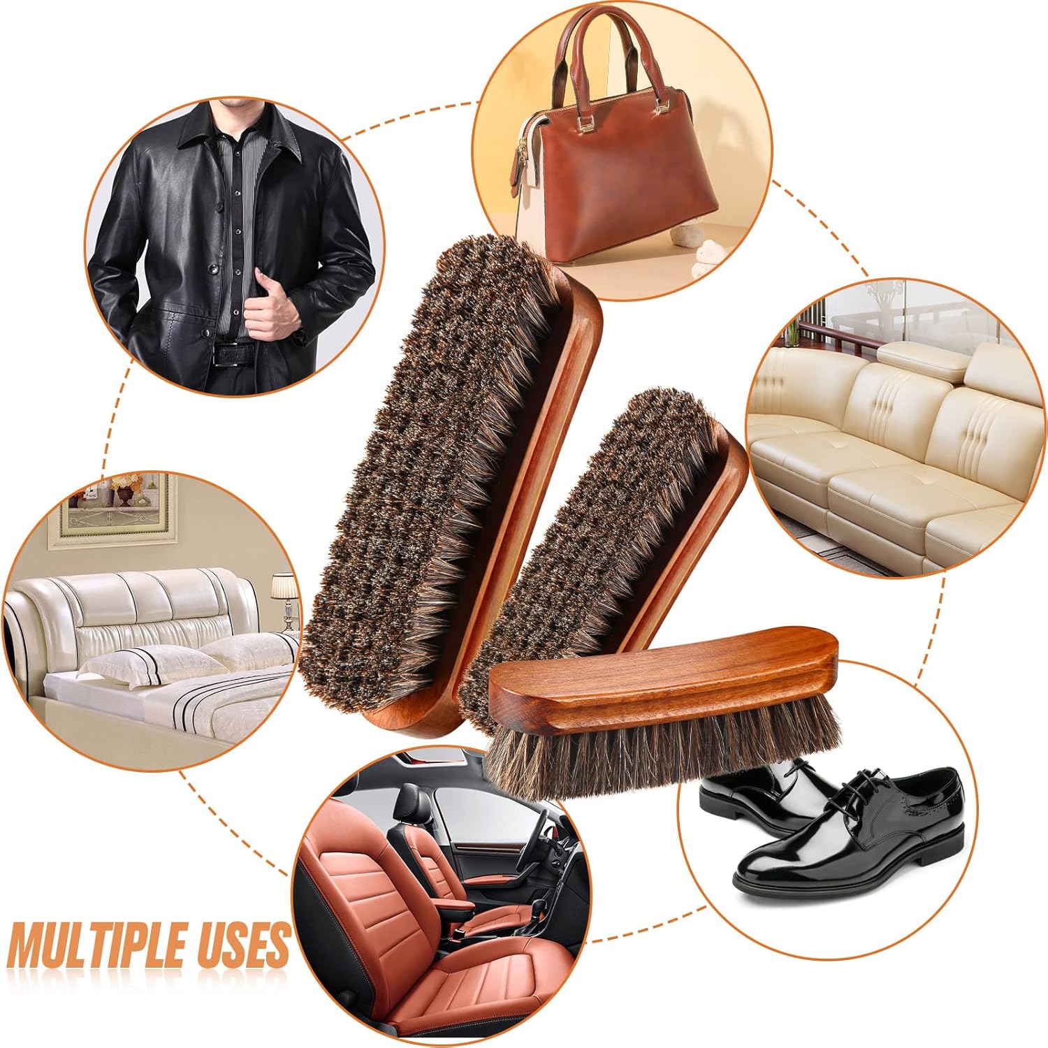 - Mufti-functional shoes brush set - This set contains extra large size horsehair shine brush, 1 x large horsehair shine brush and 1 x medium shoe brush, suitable for shoes, handbags, luggage, boots, gloves, jacket, coat, car auto upholstery
