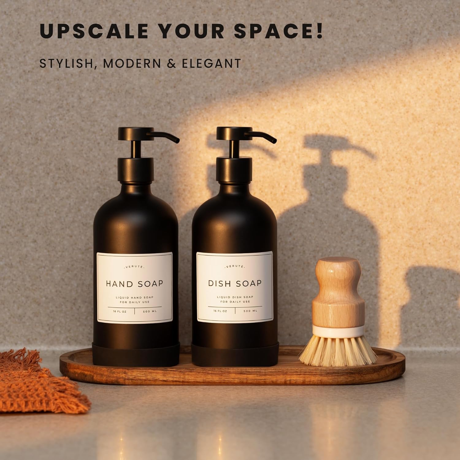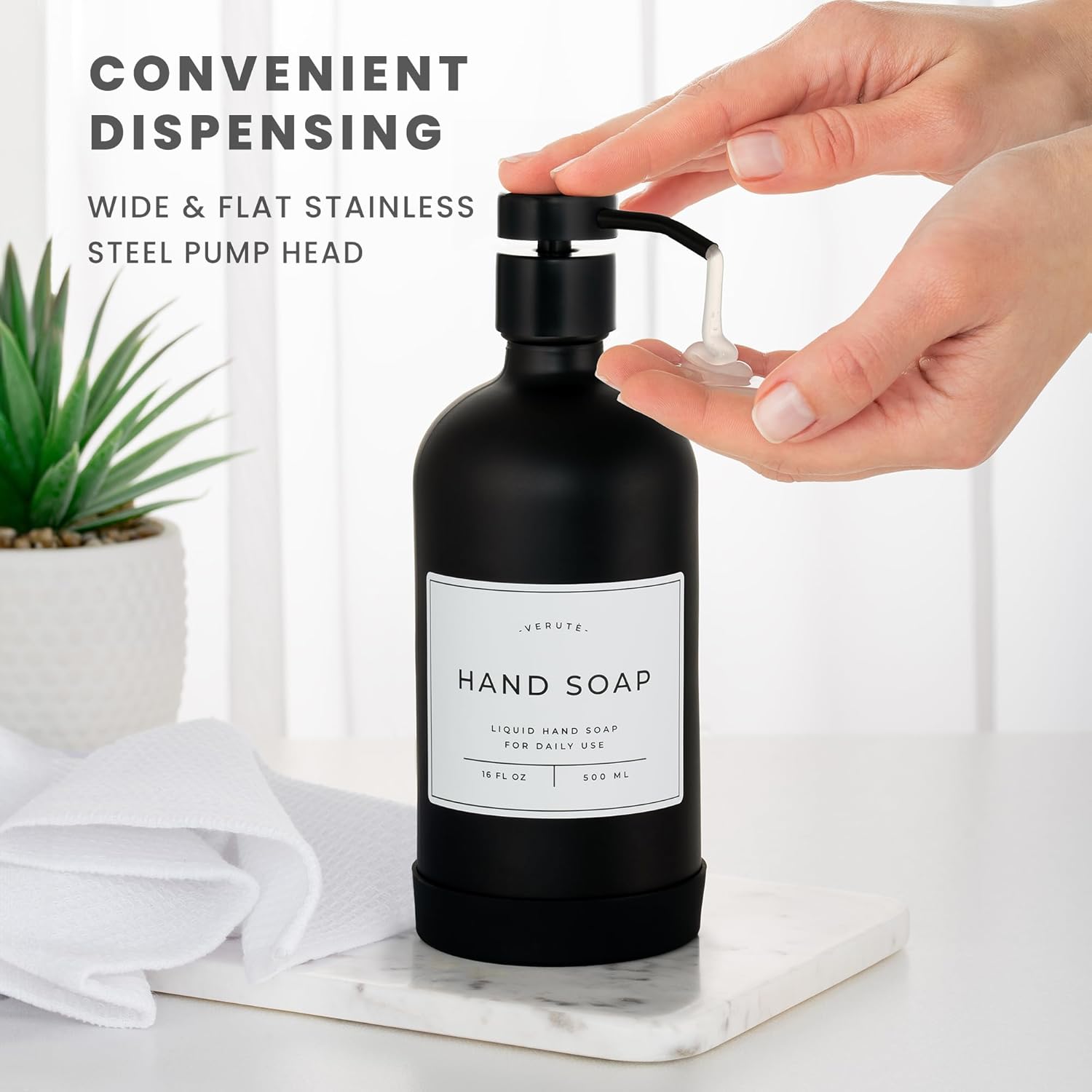 16oz Glass Soap Dispenser with Stainless Steel Pump, 21 Waterproof Labels, Non-Slip Protective Silicone Pad, Set of 2 for Bathroom & Kitchen (Matte Black Bottle/Black Pump)