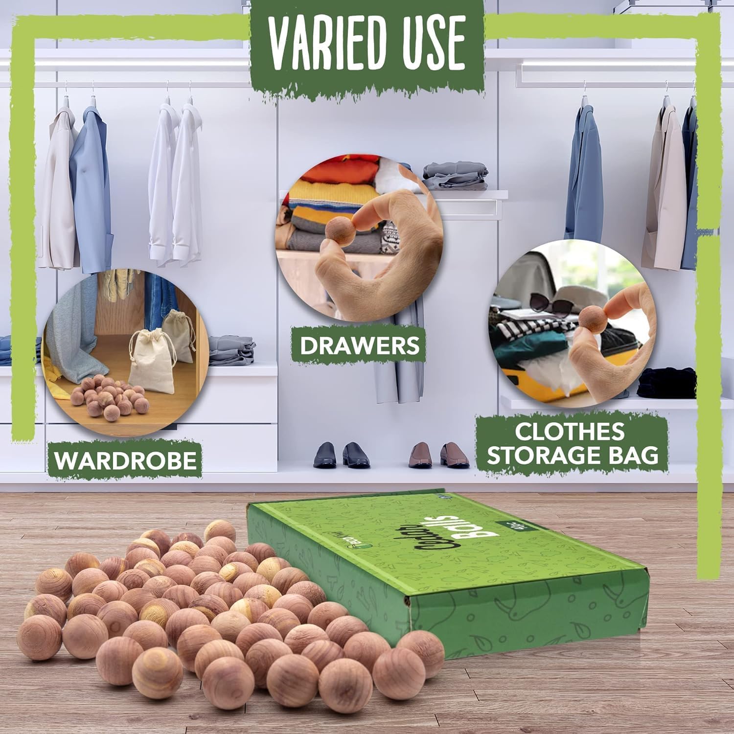 - MULTIPURPOSE & VERSATILE - Our scented cedar balls can be placed in drawers, closets, shelves, bags and more. As our balls are 100% natural, they can touch any fabric directly and won't stain or emit any smell on clothes. Our cedar wood planks for closets also reduce mustiness, absorb excess moisture and keep your wardrobe, as well as your favorite sweater, smelling delectably fresh! Simply put into the cotton bag sachets provided for the best experience.