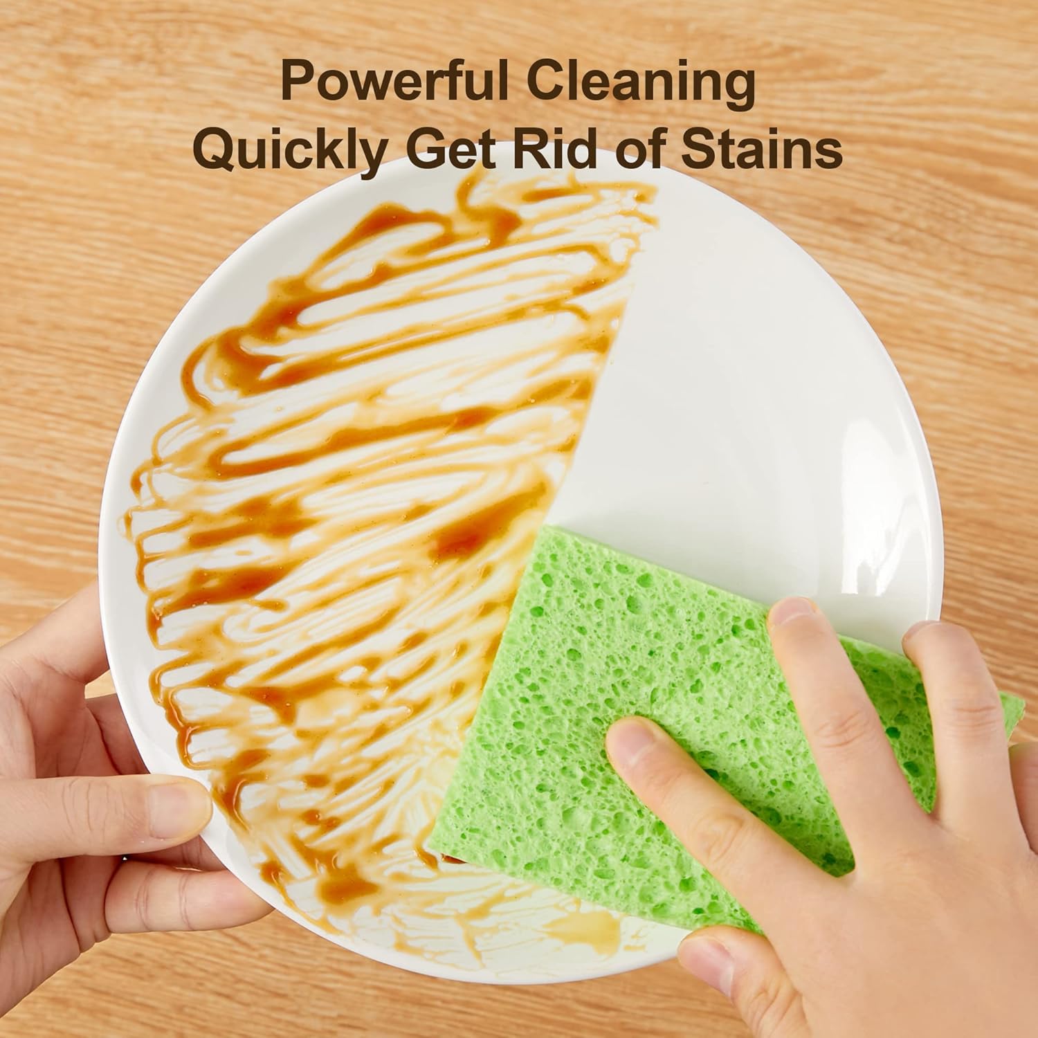 - [ABSORBENT & SOFT] The cellulose sponge will expand from a SHEET to almost EIGHT times thicker's absorbing sponge when soak up water. Completely SOFT touch for hands as well as NON-SCRATCH scrub for cleaning dishes or pans.