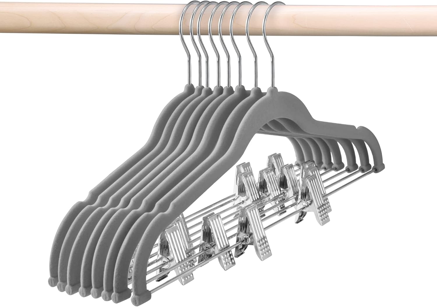 - Hangers with Adjustable Metal Clips - The attached metal clips on our gray velvet pant hangers can be easily adjusted to accommodate various items such as skirts,pants, shorts and sacrves,etc.The clips are easy to open, easy to put clothes on and off. Allowing for a seamless and smooth organization experience.