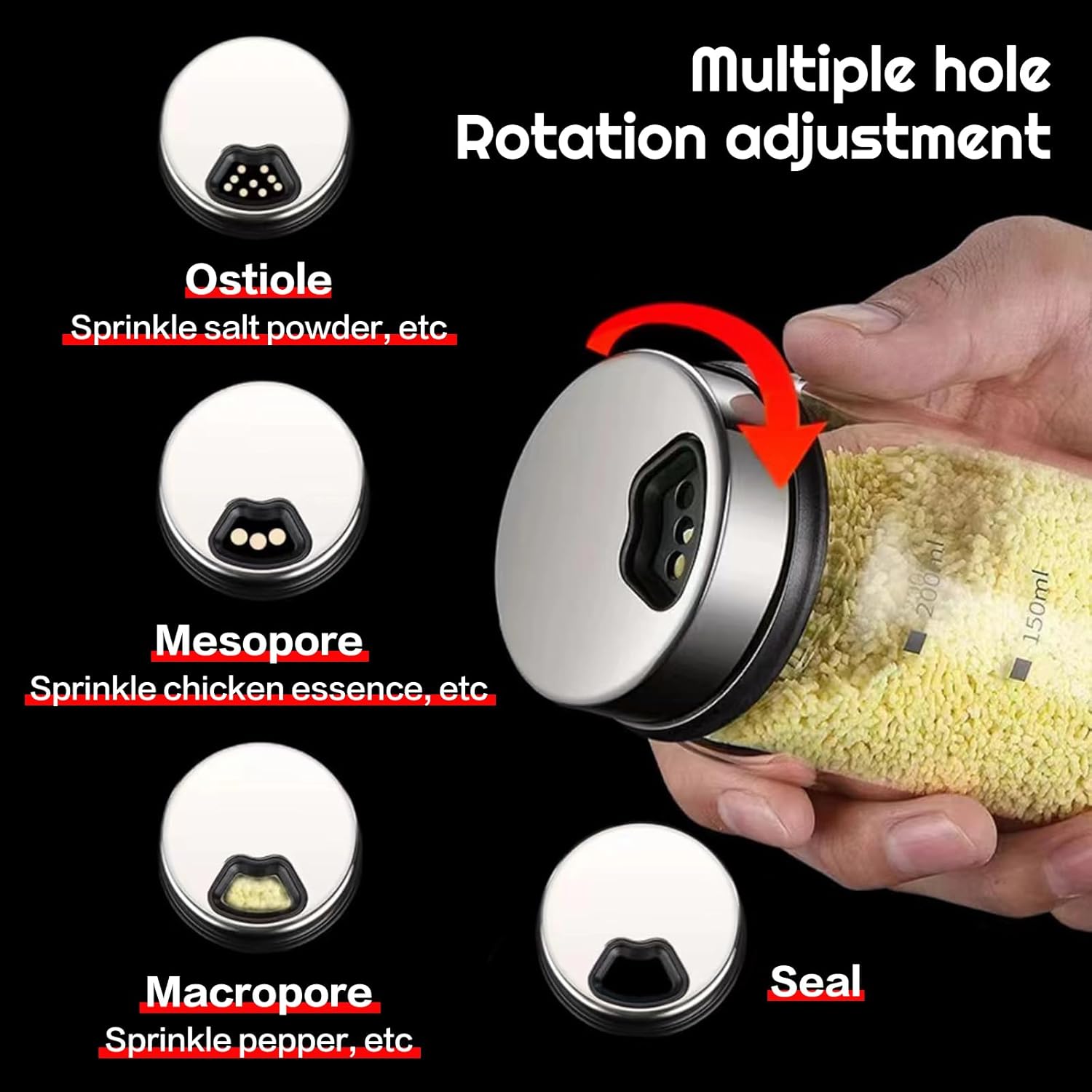 - 【SMOOTH & SECURE】The glass seasoning jar is resistant to acid and alkali, and it is easy for various seasonings to not react chemically with it. The concave anti-skid bottom makes it stand stably without falling and starts the journey of food.