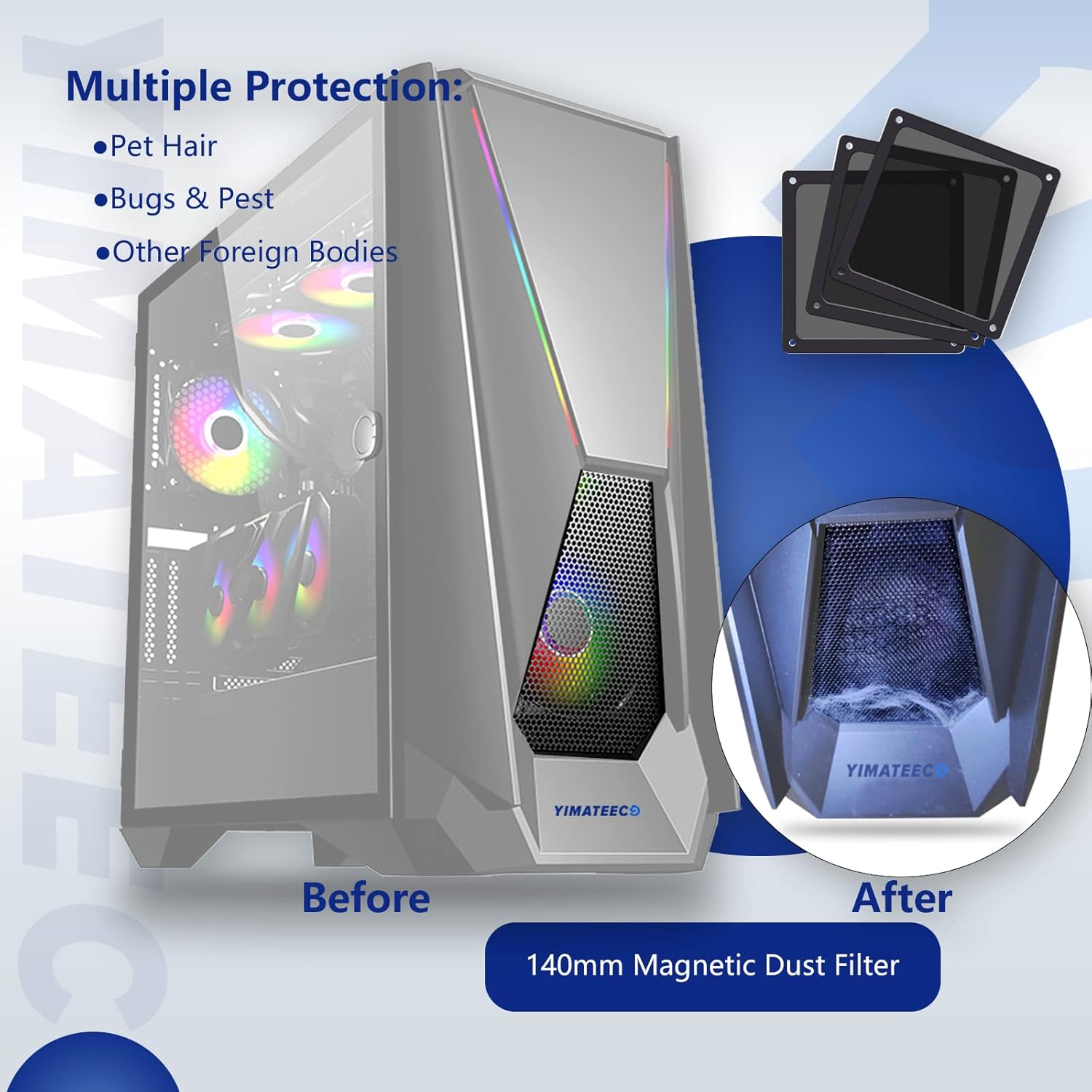- 【DELIVERY LIST】YIMATEECO Provides: 2 x 140*140mm PC Dust Filter Black (NYLON & PVC) + 4 x 40*10mm Nano Gel-Mat(Acrylic) +8 x 5*10mm M5 Fans Screws(Q235 STEEL).
