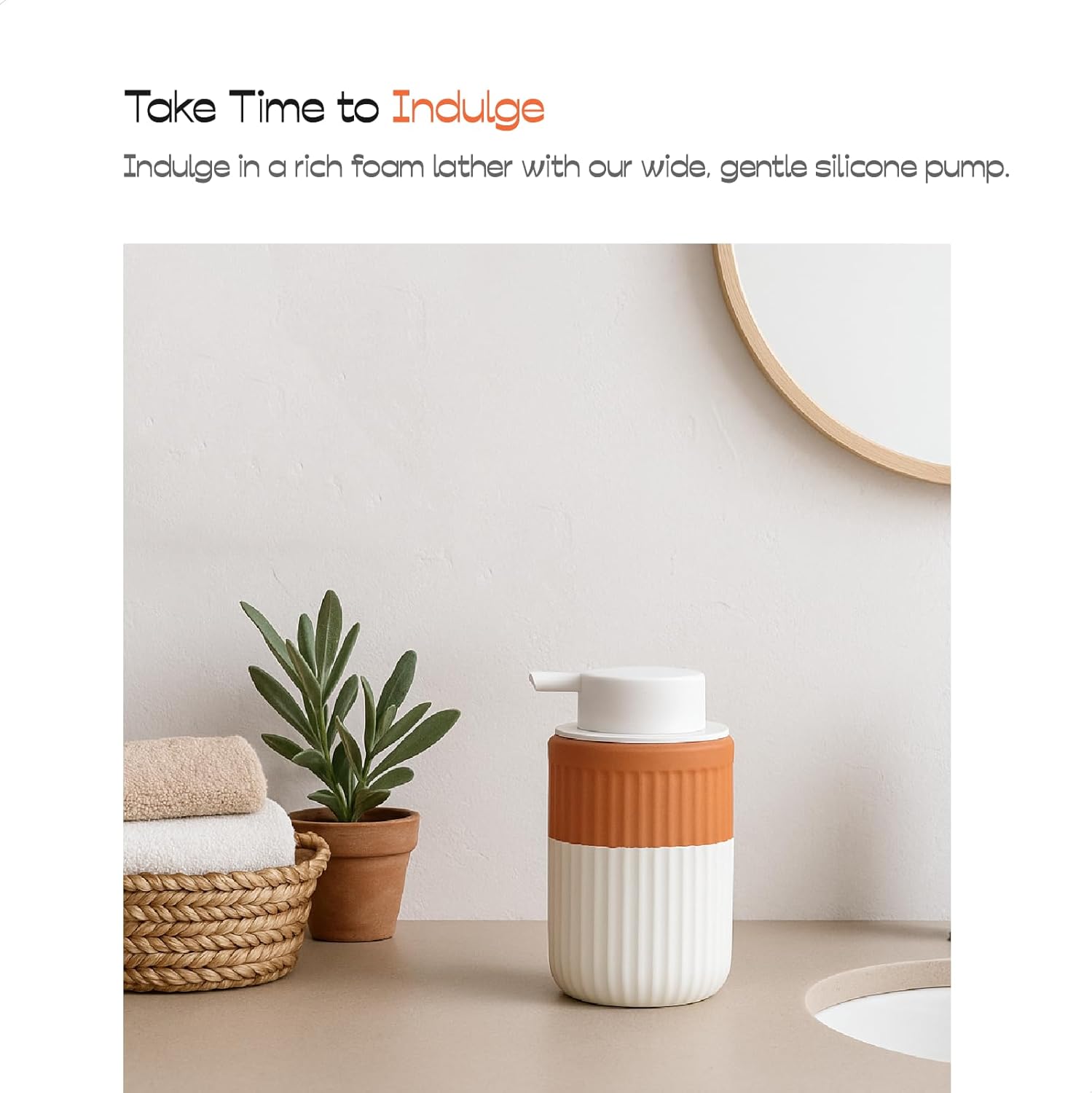 2 Pack Hand Dipped Terracotta Ceramic Foam Soap Dispenser, 12 oz Rippled Bubble-Up Bottle with White Silicone Pump, Refillable Orange Hand Soap Dispenser for Bathroom