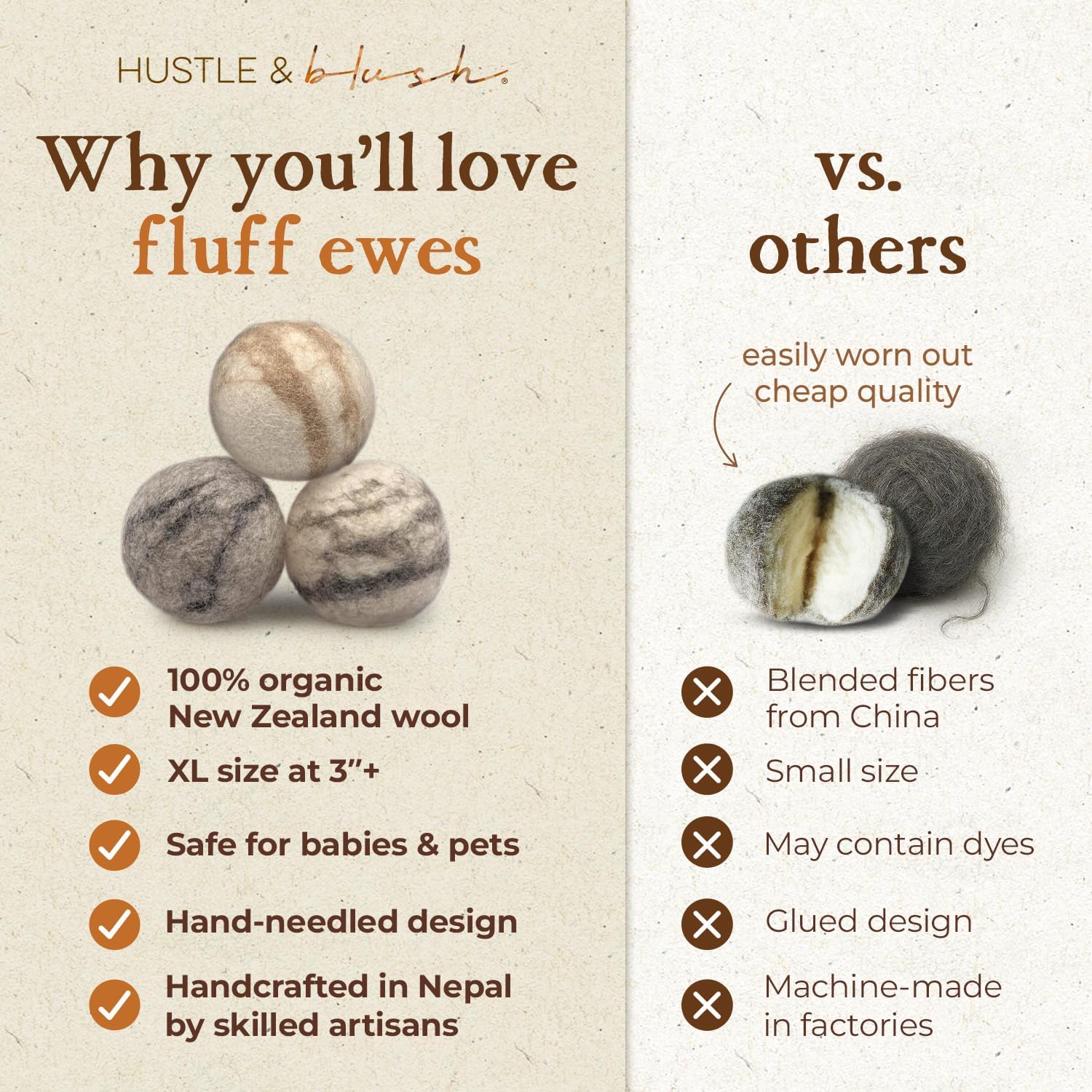 Fluff Ewes Wool Dryer Balls 3 Pack Premium New Zealand Wool Laundry Balls for Dryer, No Static Dryer Balls Laundry Reusable Cute, XL Wool Dryer Balls Cute, Baby Dryer Balls for Dryers - Marble