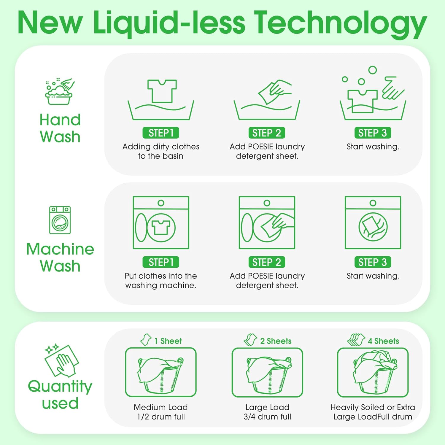 - Easier to Use - Liquidless detergent sheets, 1 sheet for small or medium loads where clothes are not very dirty, 2 sheets for large loads and 4 sheets for extra large loads, no waste. Not too little and not too much to save resources