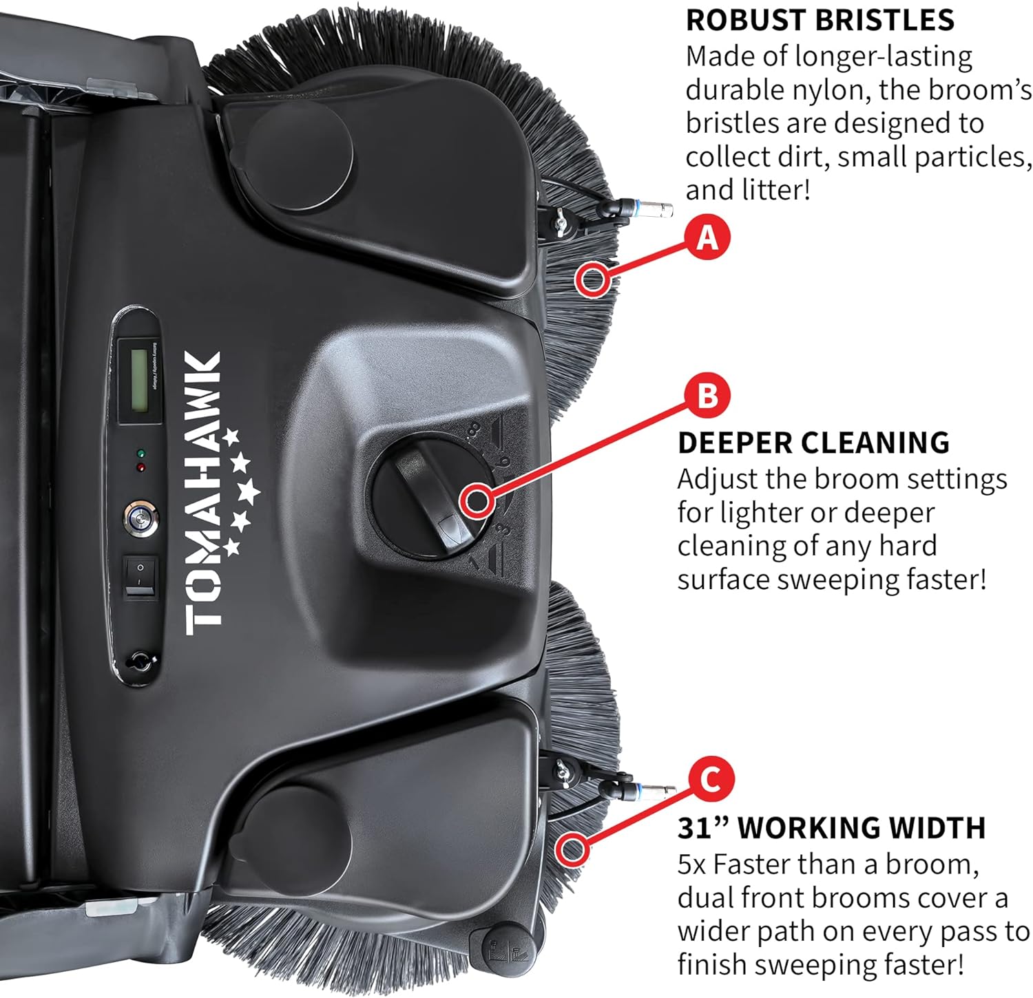 - Sweep up to 5 hours on a single charge Cover 38,000 ft²/hr indoors and outdoors and on dry or wet surfaces Sweeper has a working width of 31 in. covering a wider path Air filter prevents dust kick-up while sweeping for cleaner results Has a 1-gallon dust suppression tank with a pump power of 30W Powered triple brush sweeper system With a lightweight and compact design capable of fitting through doorways and easily stored as the handles can fold fully for storage