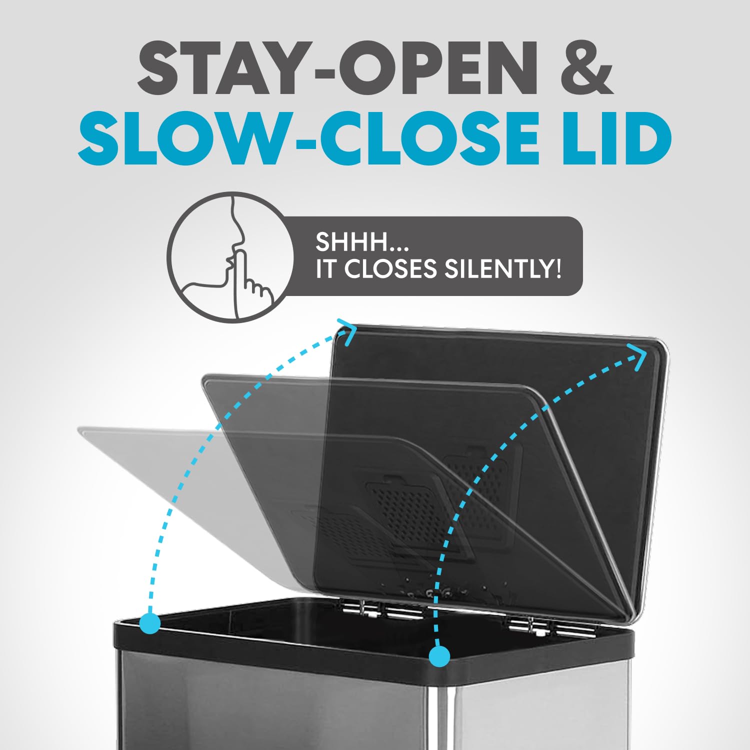 - Quiet-Close Lid: Lid closes quietly and gently without slamming. Hands Free and Fingerprint Proof: Hands-free operation with durable a metal foot pedal and fingerprint-resistant stainless steel finish leads to your trash can staying cleaner longer