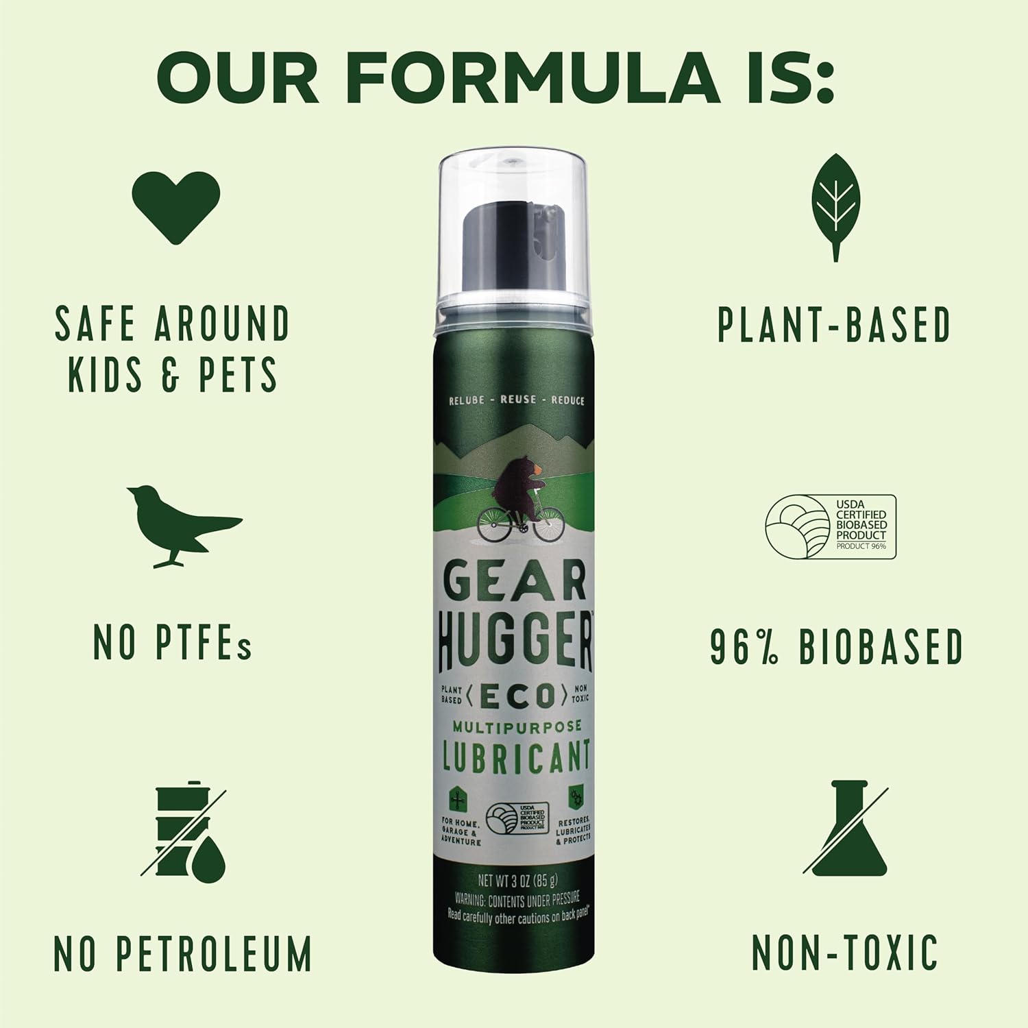 - ENVIRONMENTALLY FRIENDLY LUBRICANT THAT PROTECTS AND RESTORES WITHOUT HARMING OUR PLANET – A convenient 6-pack means you can always take it with you anywhere you need it! Make an eco-friendly choice with Gear Hugger to restore, lubricate and protect your gear so it functions optimally, lasts longer and stays out of the landfill. Gear Hugger means sustainability! Replace harsh odors, harmful petroleum and PTFE chemicals with our plant-based, non-toxic formula that’s USDA Certified 96% bio-based.