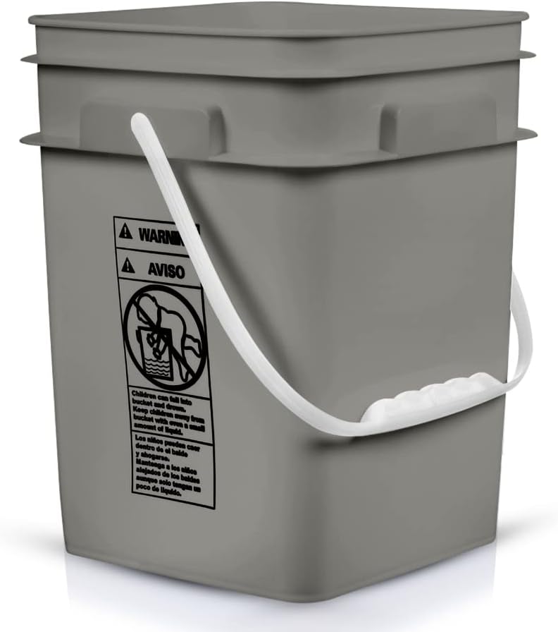 House Naturals 4 Gallon Square Food Grade Bucket Pail with Plastic Handles and Lid (Pack of 3) Made in USA containers (Gray Buckets-Green lids)