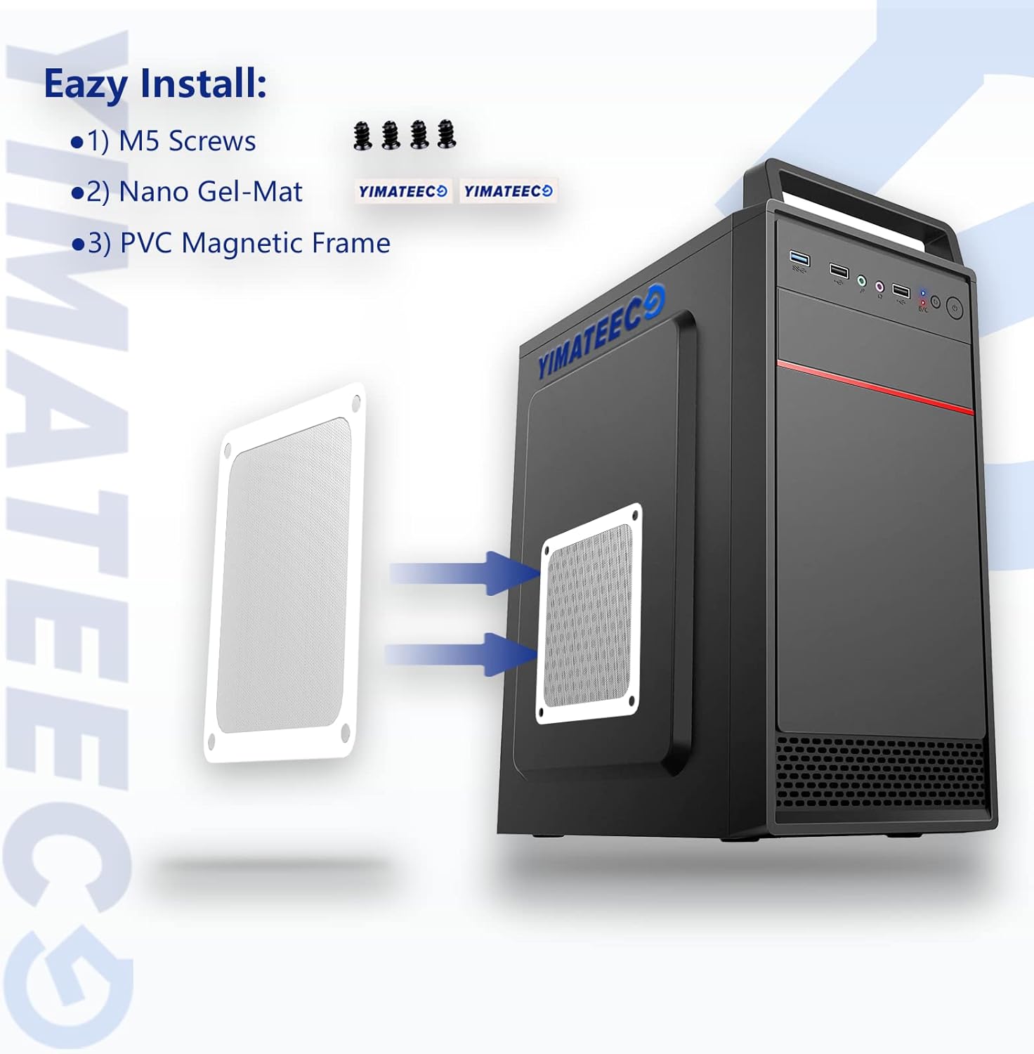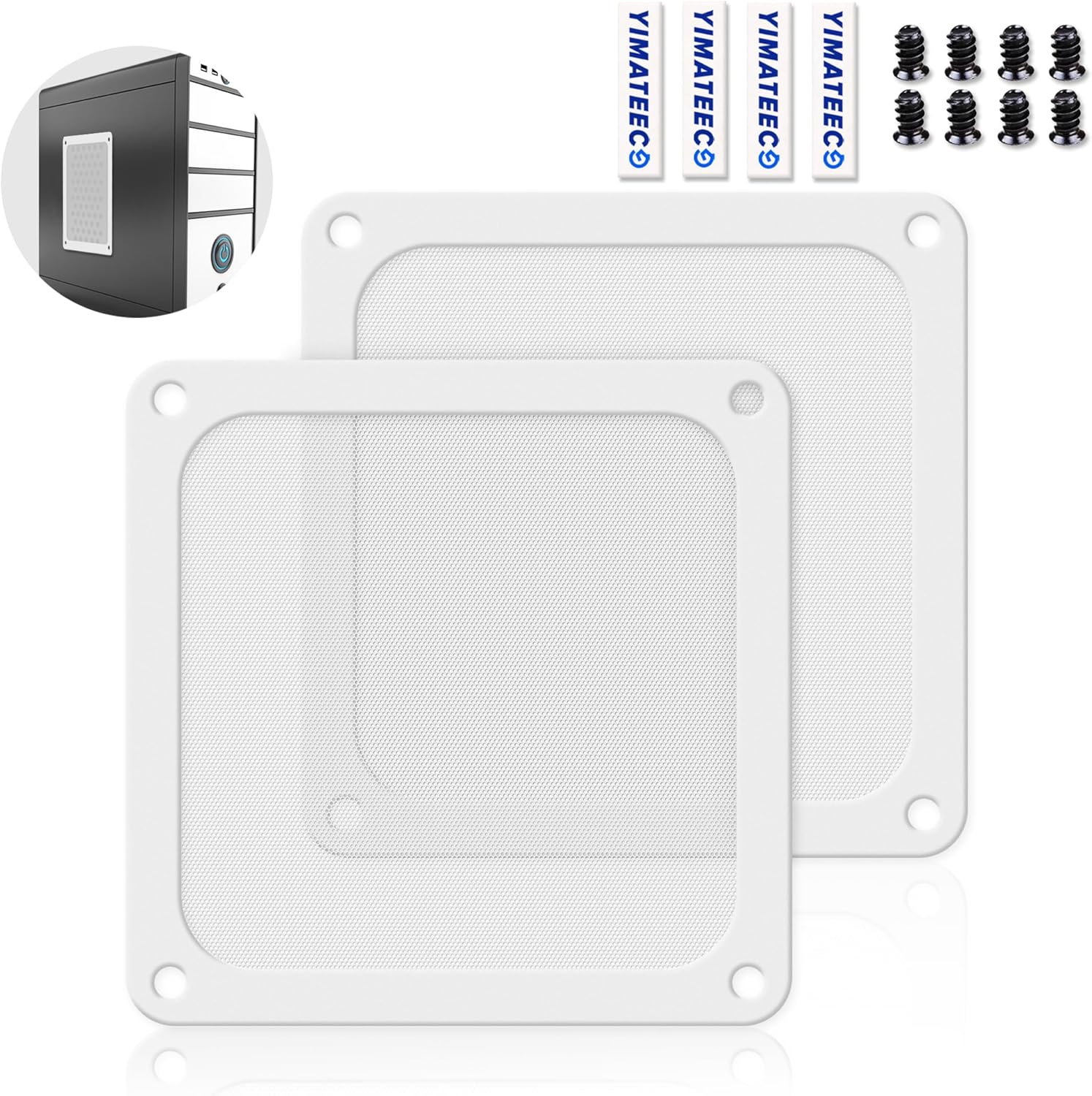- 【DELIVERY LIST】YIMATEECO Provides: 2 x 140*140mm PC Dust Filter White (PVC) + 4 x 40*10mm Nano Gel-Mat(Acrylic) + 8 x 5*10mm M5 Fans Screws(Q235 STEEL).