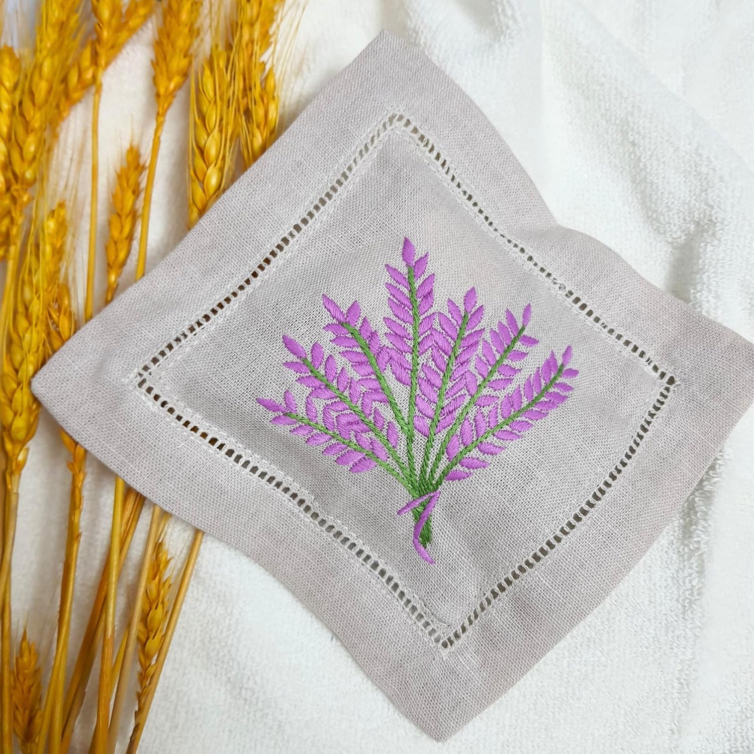 - Each sachet bag measures a convenient 6" x 6", making them the perfect size for any need. The set contains three bags, each with a dried lavender pouch included, ready for use. The bags are designed with ladder hemstitch and mitered corners, giving them a classic and timeless look that will never go out of style.