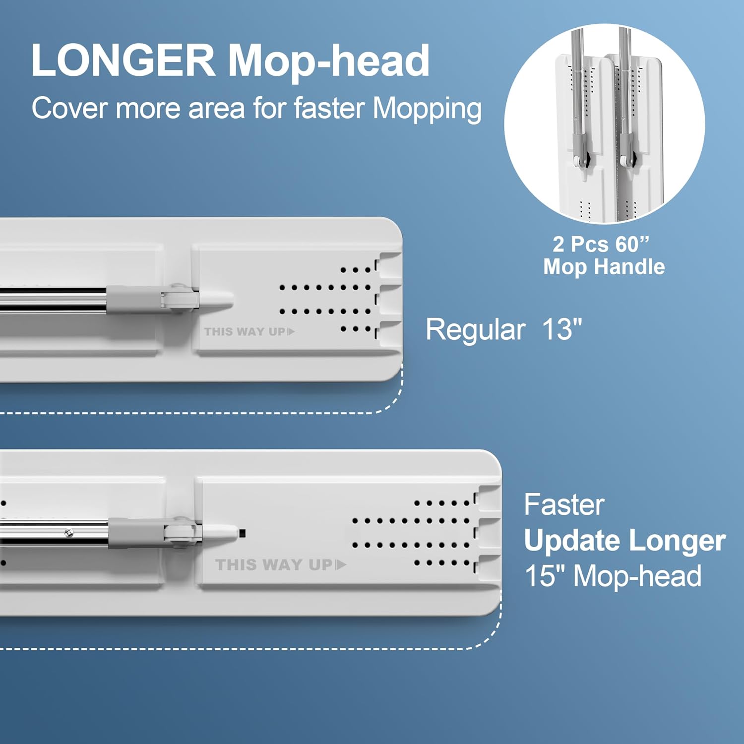 - [Longer and Larger Mop Bucket] Includes a X-Large White Bucket #5, two Extended 60" handle with Bigger 15" flat head mops! Suitable to be a wall mop or a wall cleaner with long handle. Self cleaning mop with the larger bucket, SAVE your time and labor, let the bucket do more than by yourself, mopping is just between mop and bucket, be free from dirty water, All you need to do is moving the squeeze mop